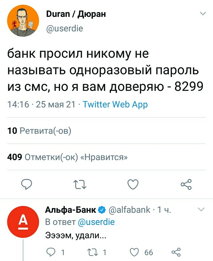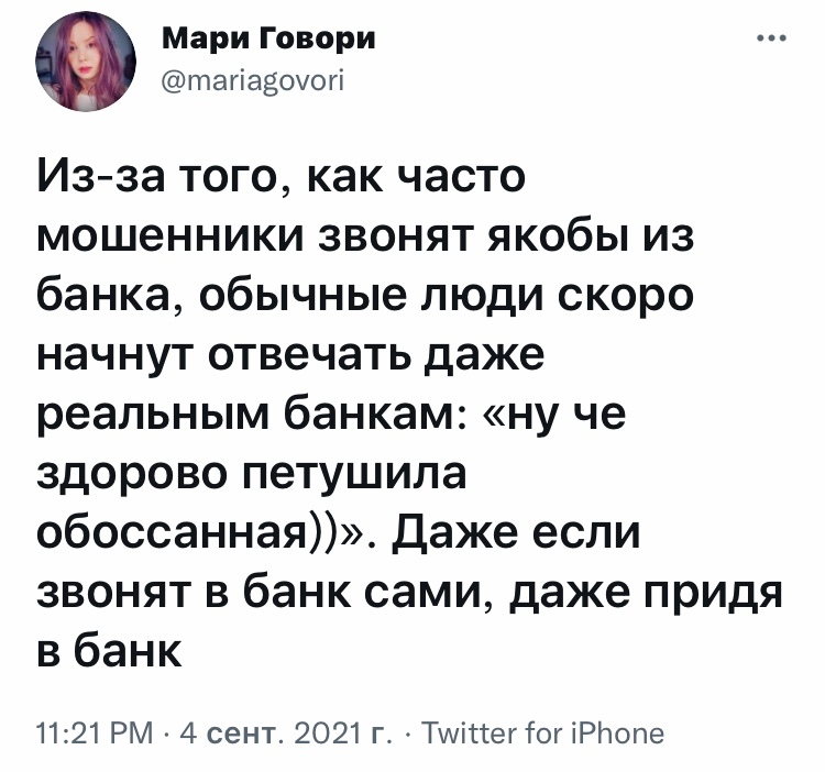 Банки просят внести кодовое слово, чтобы удостовериться, что звонящий тот самый клиент. А почему они еще не ввели в обратную сторону на волне мошенничеств? Звонит вам некто, называется сотрудником банка, а вы ему,- "Назовите кодовое слово для подтверждения, что вы банк". И все.