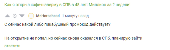 А еще @Vintraty, я видел вашу обратную связь но просто затянуло в рутине дел! Приглашаю вас снова к нам, с нас два лимонада и две новых шавермы за наш счёт!) Напишите мне в личку: https://vk.me/sredniy64, чтобы мы вас идентифицировали :)