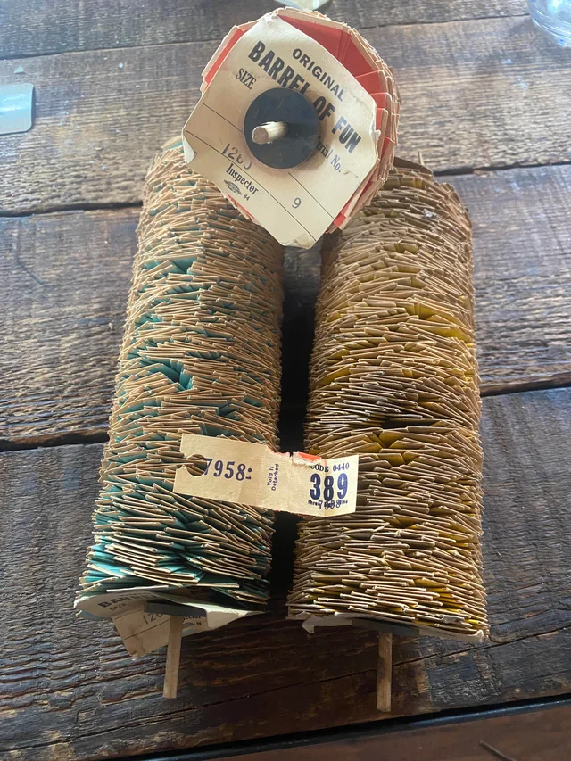 В США в барах очень часто продают лотерейки. Тянут их часто из банки. А это просто нераспечатанная упаковка, так сказать, таких билетов. Верхний слой билета можно оторвать, и под ним будет напечатана сумма выигрыша или то, что билет выиграл. Ну или ничего. Собственно, это набор старых лотереек, как видно, с номерами. Вероятно, где-то на доске на всеобщее обозрение был написан номер, который выигрывает деньги\пиво\еще что, и купившие билет сличали свой номер с выигрышным. А может, еще как-нибудь.