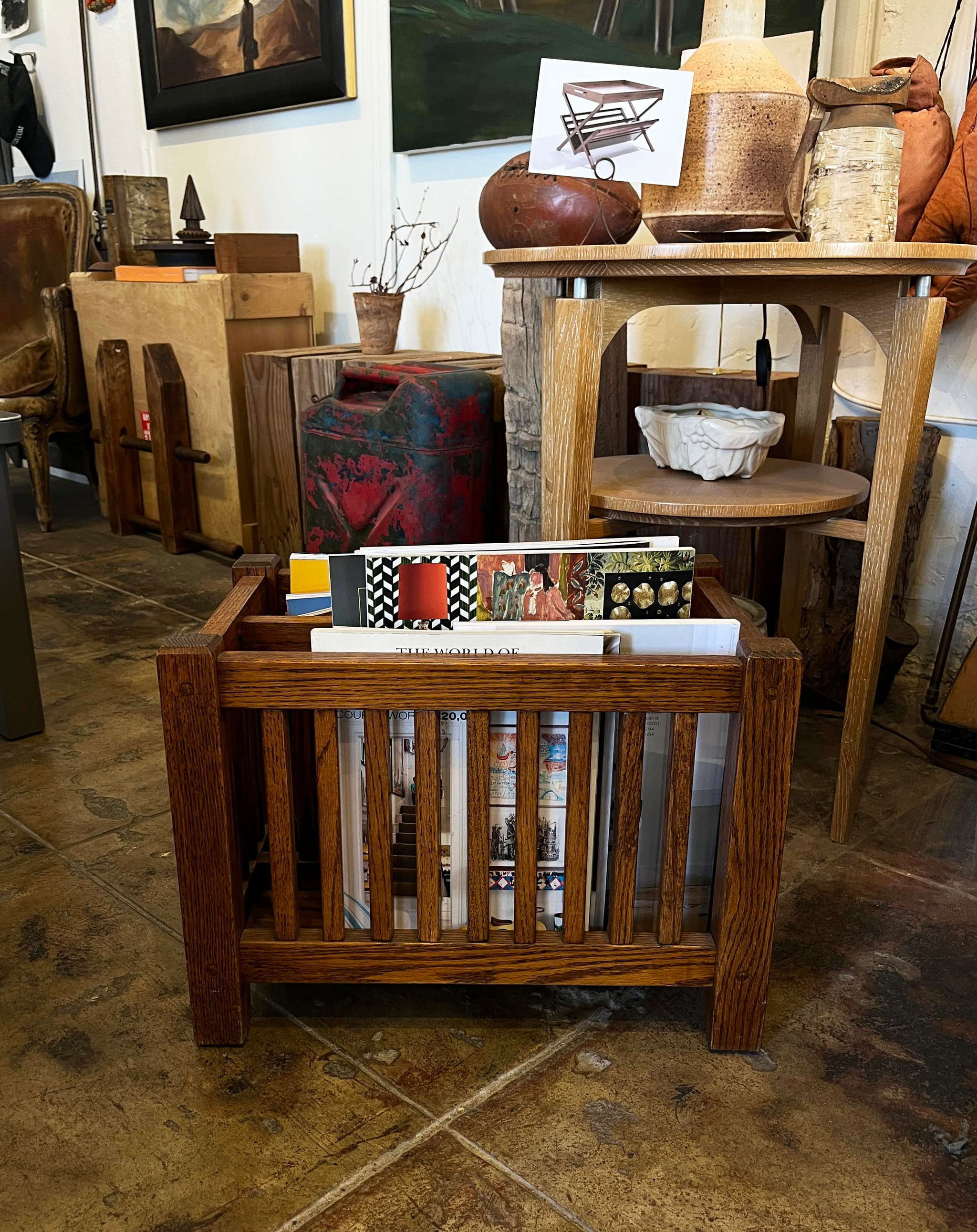 Это старая стойка для журналов и газет. За центральную палку удобно носить. Ну и если журнал один, он обопрется об нее и не сильно под углом будет.
