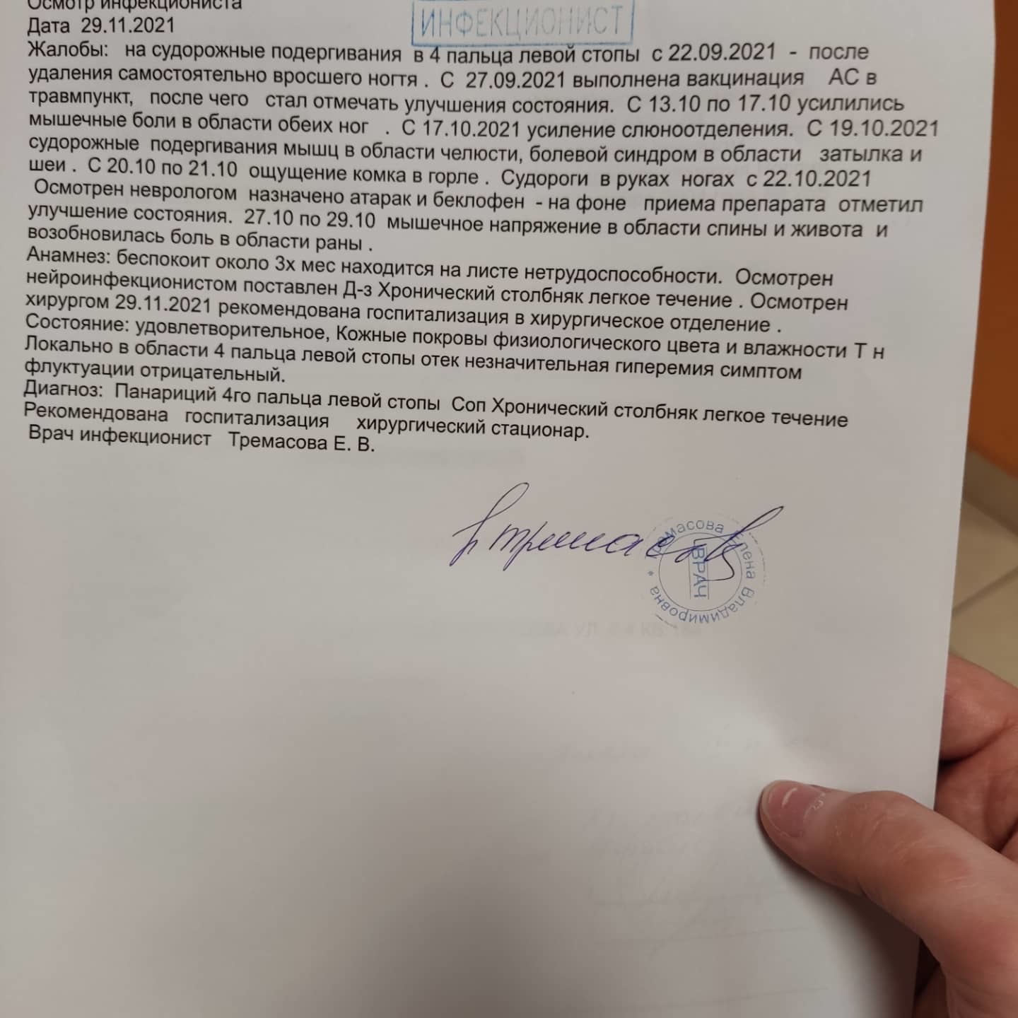 Врачи из поликлиники бессильны перед эпиднадзором, а без направления на госпитализацию ни одна больница не берётся за это. Они хотят помочь, но боятся эпиднадзора. Сегодня я был на приёме у кандидата наук инфекциониста со стажем 46 лет, он подтвердил диагноз, но сказал, что даже он бессилен ставить диагноз вопреки эпиднадзору. Поставил полинейропатию после перенесённого столбняка. Пожелал мне удачи и посочувствовал.
