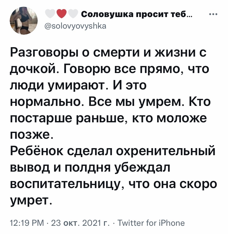 Дочь (4 года) смотрела запись утренника своего старшего брата и увидела, что на нём присутствовала мама в качестве зрителя. Была очень удивлена, что маму пустили на утренник. И тут мы с женой осознали, что из-за ковидных ограничений ни разу не были на утреннике дочери, которая ходит в сад уже 2 года, и есть ощущение, что так и не попадём. И что дочь в своей осознанной жизни не знает другой жизни без пандемии.