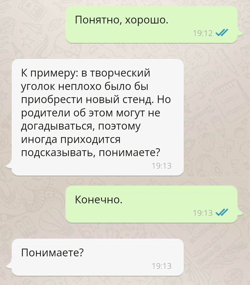 Захожу в детский садик забрать дочку. В группе стоит мужик, что-то яростно жестикулирует и чего-то яростно требует от воспитателя. Я Не стал вдаваться в нюансы, что они там делят. Жду дочку