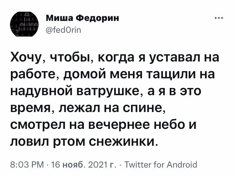 А помните то самое чувство, когда за окном декабрь, тебе лет 10, а может даже 12. Ранним утром тебя будит мама, пора собираться в школу. Глаза никак не хотят открываться, их слепит свет лампочки, под одеялом тепло, и каждая минутка в постели на вес золота. Ты спрашиваешь: а может не пойду сегодня в школу? И мама такая, ну ладно, не ходи) И вот оно, то самое, ощущение беззаботности и счастья. Мама выключает свет, ты укутываешься в одеяло, ложишься на бочок и засыпаешь. А за окном ещё темно, мороз, снег хрустит под ногами тех "кому не так повезло", им когда нибудь тоже "повезет", но не сегодня, сегодня твой день. И не важна причина, почему в школу можно не идти, просто так получилось. И ты спишь, самым сладким и глубоким сном. Впереди вся жизнь, учеба, работа, суета, нервные срывы, "выгорание", первая любовь и первые остеохондрозы, победы и промахи. Но это все в будущем, а пока есть утро, мороз, теплое одеяло и то самое чувство.