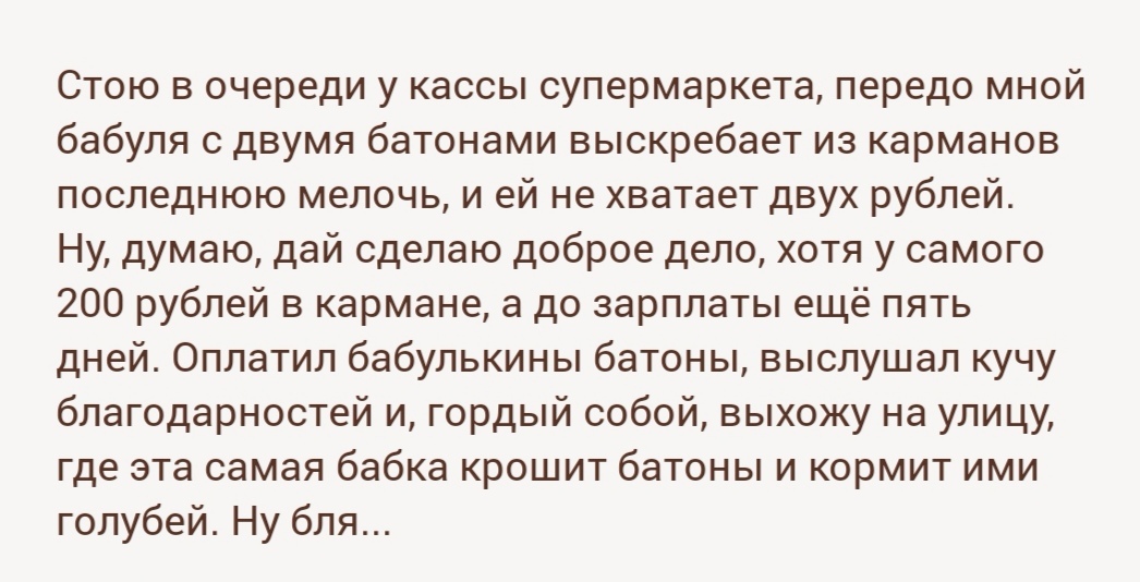 На днях заехал в магазин. Купил перекусить, сижу в машине, жуюсь... Подходит мужик бомжеватого типа, стучится в окошко... "Очень сильно извиняюсь, но у вас не будет случайно 4 рубля??? Не хватает на чай..." Достаю кошелёк, выгребаю всю мелочь и протягиваю ему.
