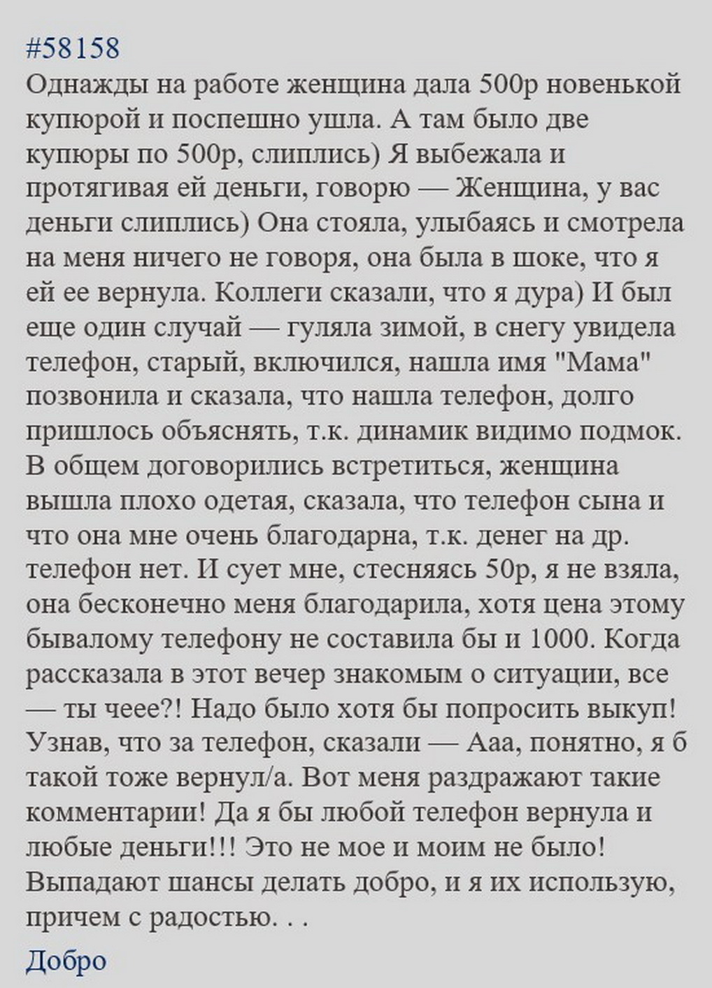 Время 9 вечера. И тут муж звонит соседу снизу, с которым они как-то качели во дворе варили. И он без разговоров соглашается! Надо? Ну поехали, ребенок это святое. До лагеря 3 часа, там полчаса, обратно ещё три... Ни слова о вознаграждении, попросил только воды купить... С работы, даже не поев... и завтра ему опять на работу... Когда выяснилось, что мы неправильно посчитали время, и вместо 12 ночи вернемся в 3, было очень стыдно... А когда оказалось, что из этих 200 км в одну сторону 70 по грунтовке-однополоске хренового качества без освещения, я сквозь сидушку чуть не провалилась... А он ни слова не сказал... Приехали в четвертом часу ночи... Заправили ему полный бак взамен потраченного, хотя он об этом даже не заикался, собрали все деньги, что были в доме до зп (всего 5 тыс), муж отдал пошел. Доживем.