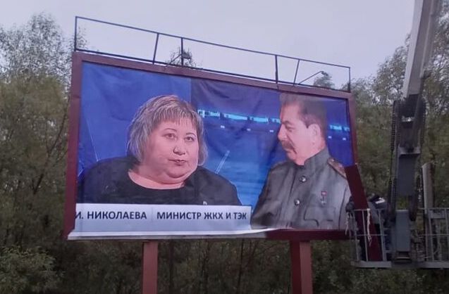 В Боровичах на билборде разместили плакат, на котором товарищ Сталин строго смотрит на министра ТЭК и ЖКХ Новгородской области Ирину Николаеву.