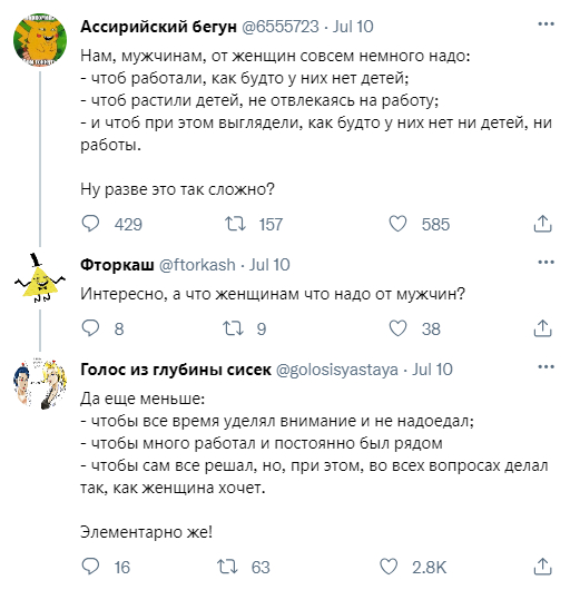 Заходят они к нам в гости. Сидим за столом, моя жена спрашивает Алену: "Что больше всего запомнилось в России?" А та отвечает: "У вас очень наглые женщины". Жена уточняет, мол поругались что ли с кем-то? А Алена говорит, что никогда не видела, чтобы ВСЕ мужчины всегда уступали дорогу женщинам. Дословная цитата: "Ходят как королевы". Мол могут спокойно втроем идти по всей ширине тротуара или остановиться и начать разговаривать, заставляя обходить по траве. Никогда не уступают дорогу, никогда не пытаются разминуться с мужчинами, словно не замечают, что есть еще один живой человек.