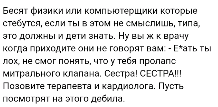 — Ну на хуй, тоска такая, пойду в медики, там хоть на трупы в анатомичке посмотреть можно.