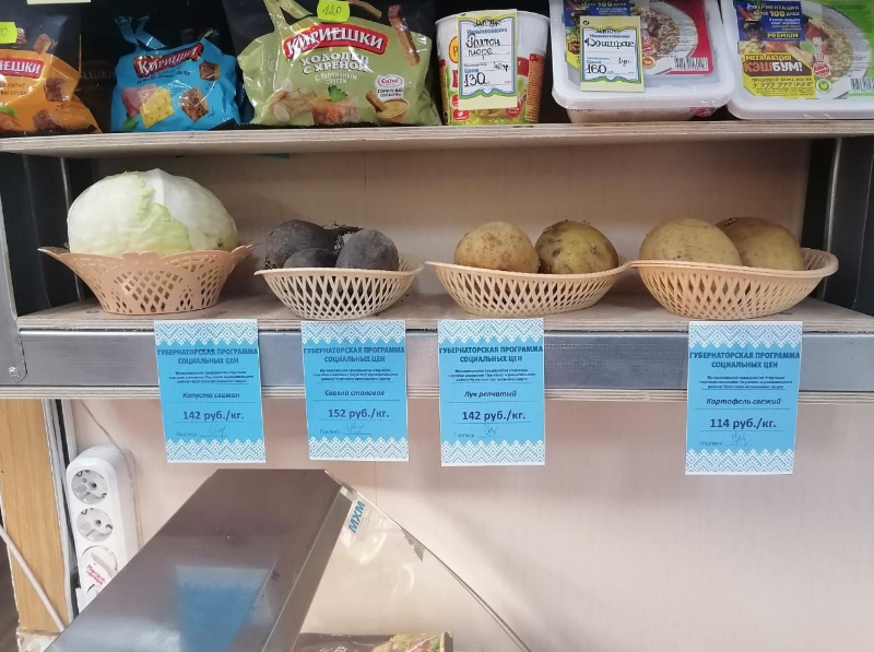 По поводу цен на продукты нашлось следующее. В регионе есть специальная программа, по которой на некоторые продукты устанавливаются сниженные цены. Для этого специальные голубые ценники сделали: