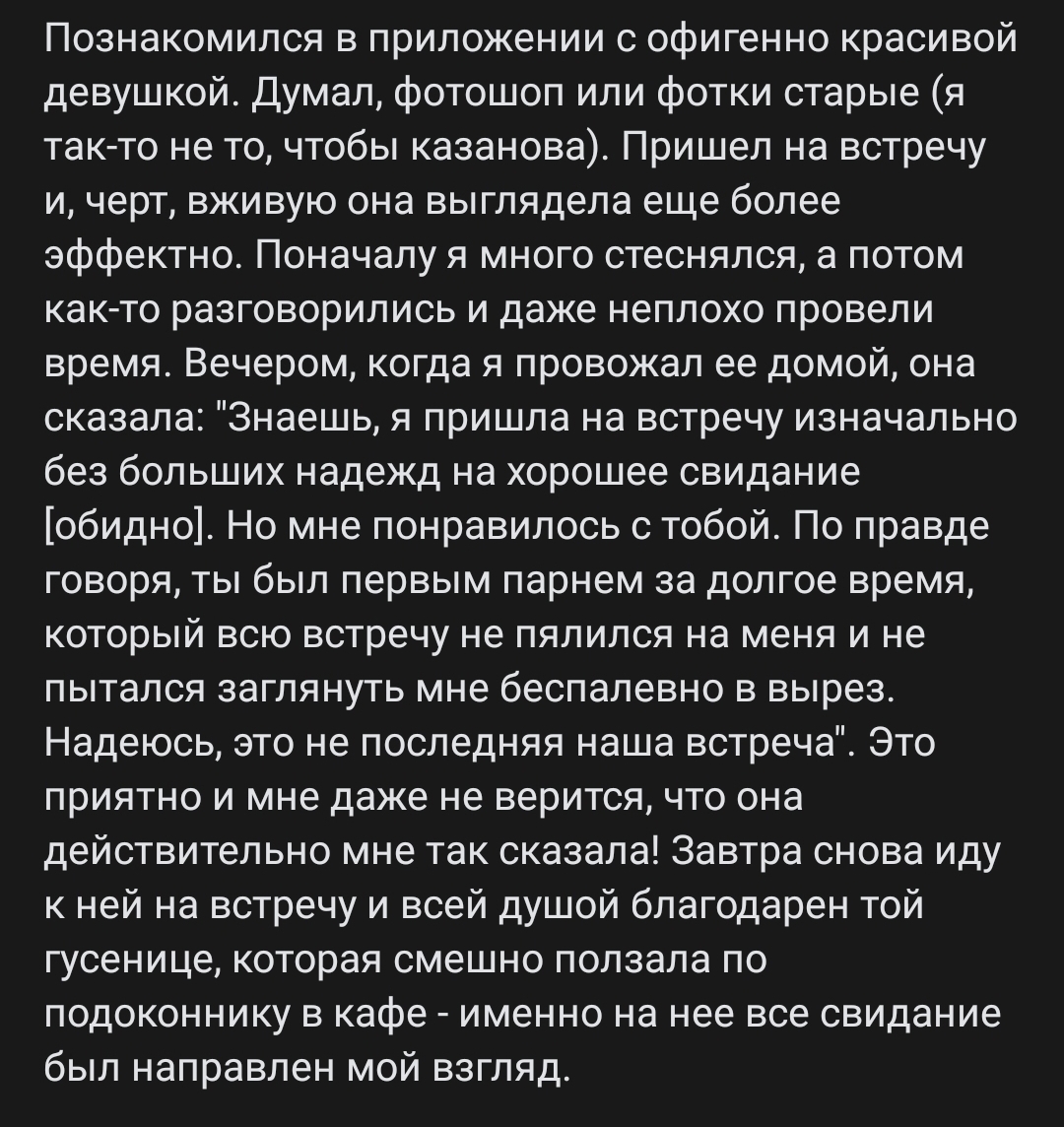 Наученный опытом я здороваюсь, дожидаюсь ответного приветствия и дабы избежать годовой переписки отправляю краткое резюме о себе (примерно как в начале поста). Реакции на это разные. Кто-то удивляется открытости и правдивости, кто-то рад тексту, а не очередному дикпику/приглашению в гости сделать массаж и прочей ахинее, кто-то идет еще дальше и о боги направляет в ответ примерно схожее резюме избавив нас от кучи - вопрос-ответ и сэкономив обоим кучу времени. Далее уже определяемся по местонахождению. И да этот фактор критичен мне не потому, что я лентяй. А потому, что есть куча обязательств, работа, собака и соответственно освободившись в определенное время даже в 19-20 часов вечера дорога на противоположный конец Москвы займёт 1,5 часа минимум. И если для первых свиданий проблем с дорогой на выходных значительно меньше, то с перспективой завязывания отношений и желанием видеться чаще начнется полный треш. Так же я слабо верю в отношения на расстоянии, между городами.