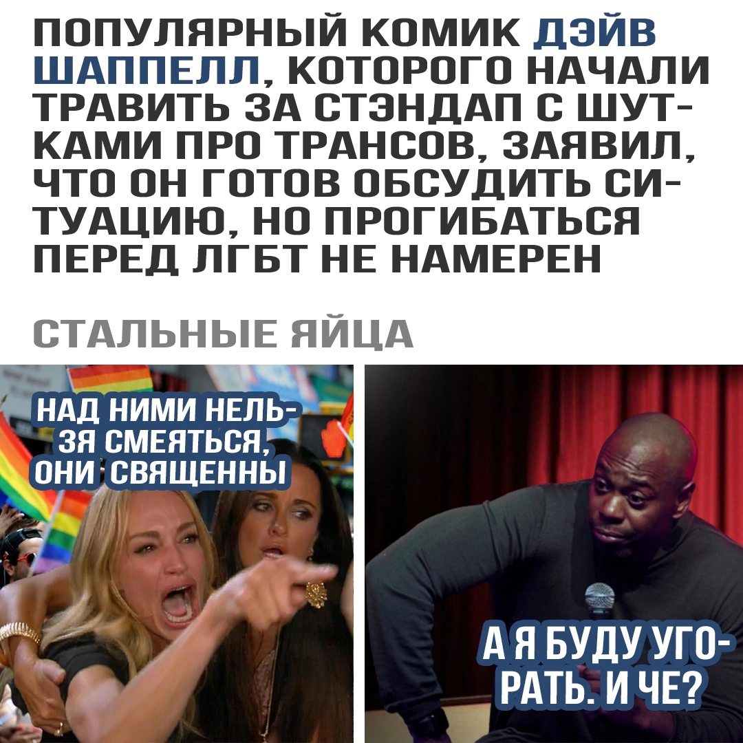Он также подчеркнул, что выступает за свободу слова и свободу творчества и не считает, что концерт Дэйва Шаппелла «переходит границы», за которыми его можно считать провоцирующим ненависть или насилие. В общем, поступил как настоящий мужчина с большими balls!