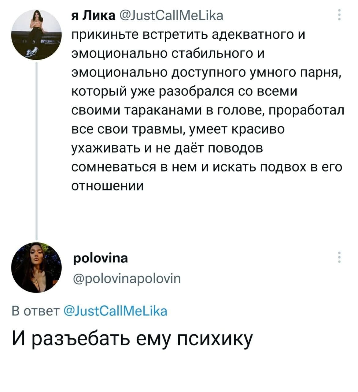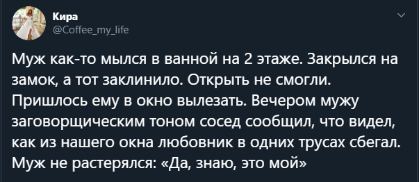 У меня сложились очень тёплые дружеские отношения с мамой моего мужа. Мы часто вместе гуляем или ходим в кино. На днях ехали на дачу, и в пробке со мной пытался познакомиться мужчина. Я его отшила, разумеется, а она мне: "Ну и чего ты? Приятный мужчина же и состоятельный, видно. Познакомилась бы". Я на неё смотрю глазами по 5 копеек, и тут она, хлопнув себя по лбу: "А, ну да, я забыла".