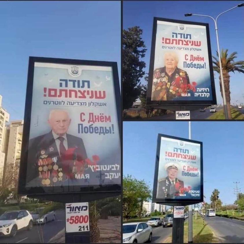 Плакаты вдоль дорог города Ашкелон в Израиле. На иврите написано- спасибо что победили .