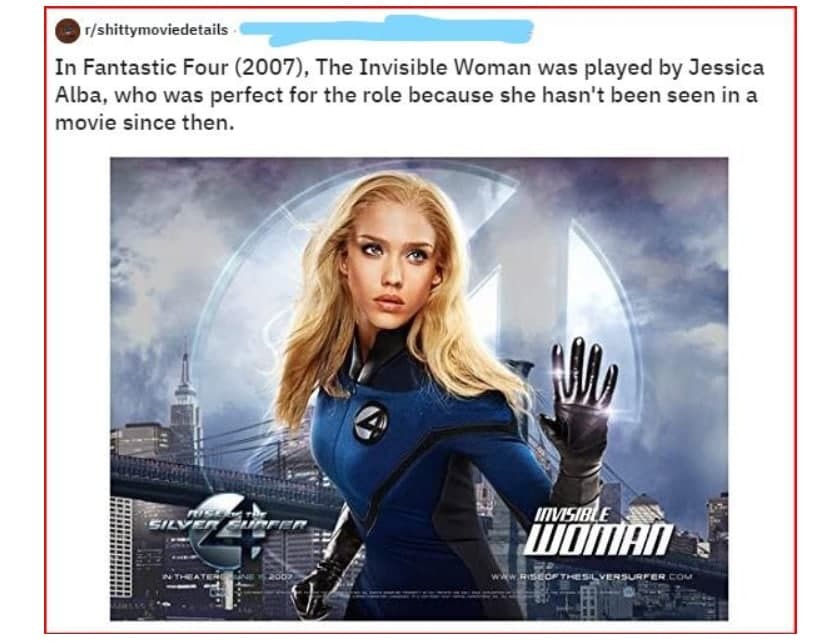 Джессика Альба так хорошо сыграла роль Женщины-невидимки в фильме Фантастическая четвёрка: Вторжение Серебряного сёрфера (2007 год), что после этого ее никто не видел в крупнобюджетных фильмах