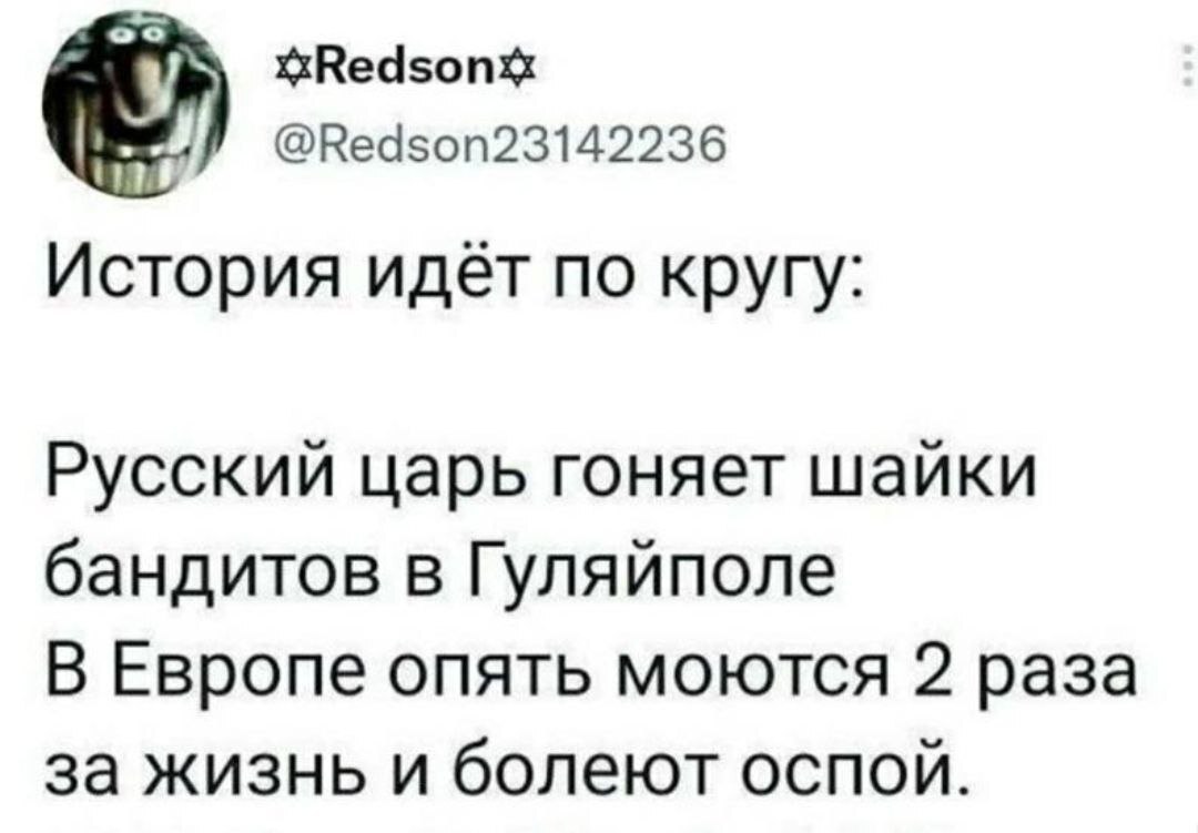 Только что на Viasat History посмотрел передачу про Наполеона, про его приход к власти и военные кампании, описали часть про вторжение Наполеона в Россию словами "Наполеон победил, но огромной ценой". Критерием победы Наполеона по версии Viasat History стало взятие Москвы. Про Бородино ни слова, французы умирали исключительно из-за голода и холода, про тактику выжженной земли ни слова. Окончательно добило меня продолжение этой саги, сразу после победного ухода Наполеона из России (1812 год) начали рассказывать про победу британцев над Наполеоном в битве при Ватерлоо (1815 год). Про штурм Парижа русскими войсками (1814 год!) и отречение от власти после этого Наполеона ни слова. Если в школах западных стран преподают историю в таком же ключе, то поведение западного политикума по отношению к России совсем не удивительно.
