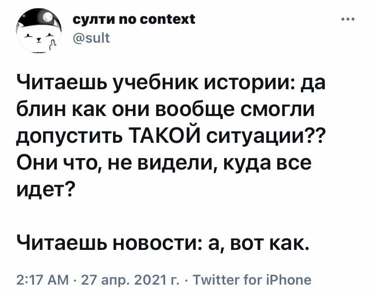 Я - Извини, что перебил, но дай закончу: у нас было крепостничество. Ты читал ведь Толстого? Войну и Мир? Наверняка помнишь про прислугу. Просто не придал значения, думая, что это как у Вас в Англии прислуга. Так вот, ты ведь знаешь, что у дворян были свои крепостные крестьяне, которых они продавали, покупали, били, заставляли работать бесплатно, и относились к ним не более, чем к вещам? И эти крестьяне - мои предки. И почти все тут присутствующие точно такие же потомки настоящих «белых рабов». Дворян после 1917 года считай не осталось, во время революции их всех или расстреляли, или они сами мигрировали. Мы - единственные белые за всю историю существования, которые не импортировали рабский труд из других стран. Так с чего бы мне чувствовать стыд за себя? Ты - другое дело. Твоя родня наверняка пользовалась благами своей цивилизации за счёт того, что где-то грабили и убивали негров, но это грехи твоих предков, а наши своё отстрадали за сотню поколений негров, поэтому не трогай нас.
