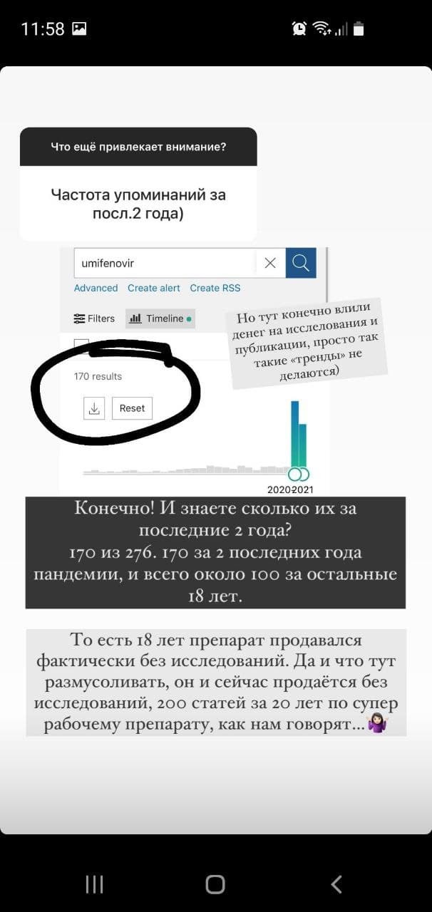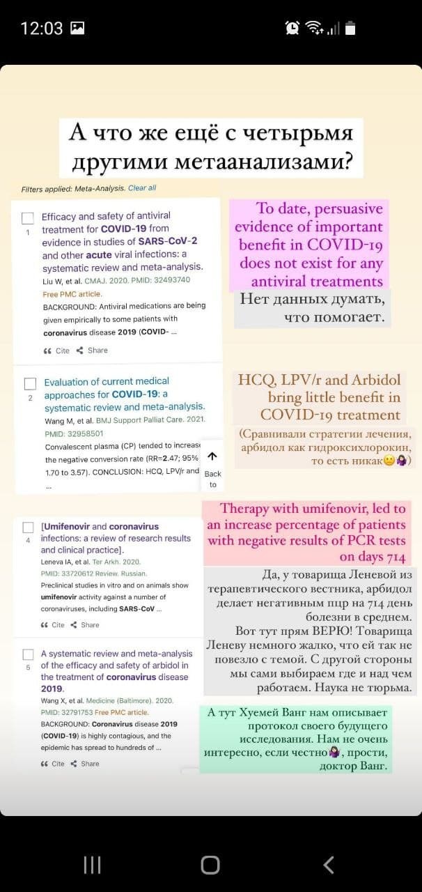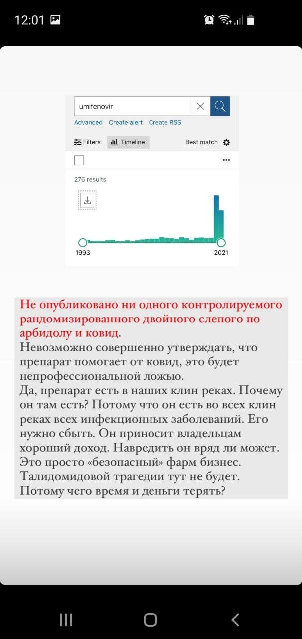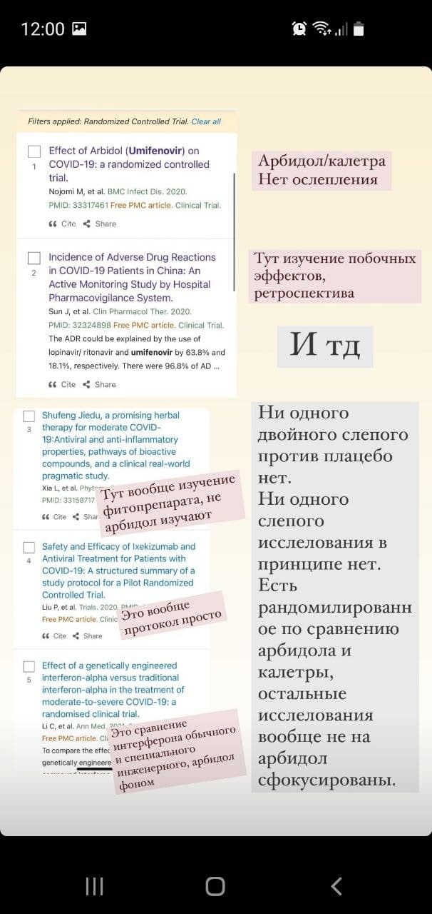 Помимо выговора от начальства, доктор подверглась хейту от "а мне помогло111!" Удручает то, что и среди ее коллег есть сторонники арбидола. Какие же аргументы За арбидол? Да, он есть в клинических рекомендациях, врачи обязаны его назначать пациентам, но, к сожалению, нет никаких подтверждений его эффективности, нигде в мире не применяют и знать не знают про наш чудо-препарат. Да, на Пабмед о нем 270 статей, но имеет значение только качество этих статей и описанных в них исследований. Конечно, обыватель не пойдет в этом разбираться. Иммунолог из Парижа (ник petitebete) сделала разбор этих статей у себя в инстаграме в поддержку доктора.
