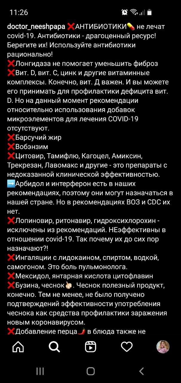 Пульмонолог из Казани подверглась внушению и предупреждению от начальства за свой пост в инстаграме, в котором описала неэффективные способы и препараты для лечения ковид19, арбидол в том числе. Ее вынудили подправить текст.