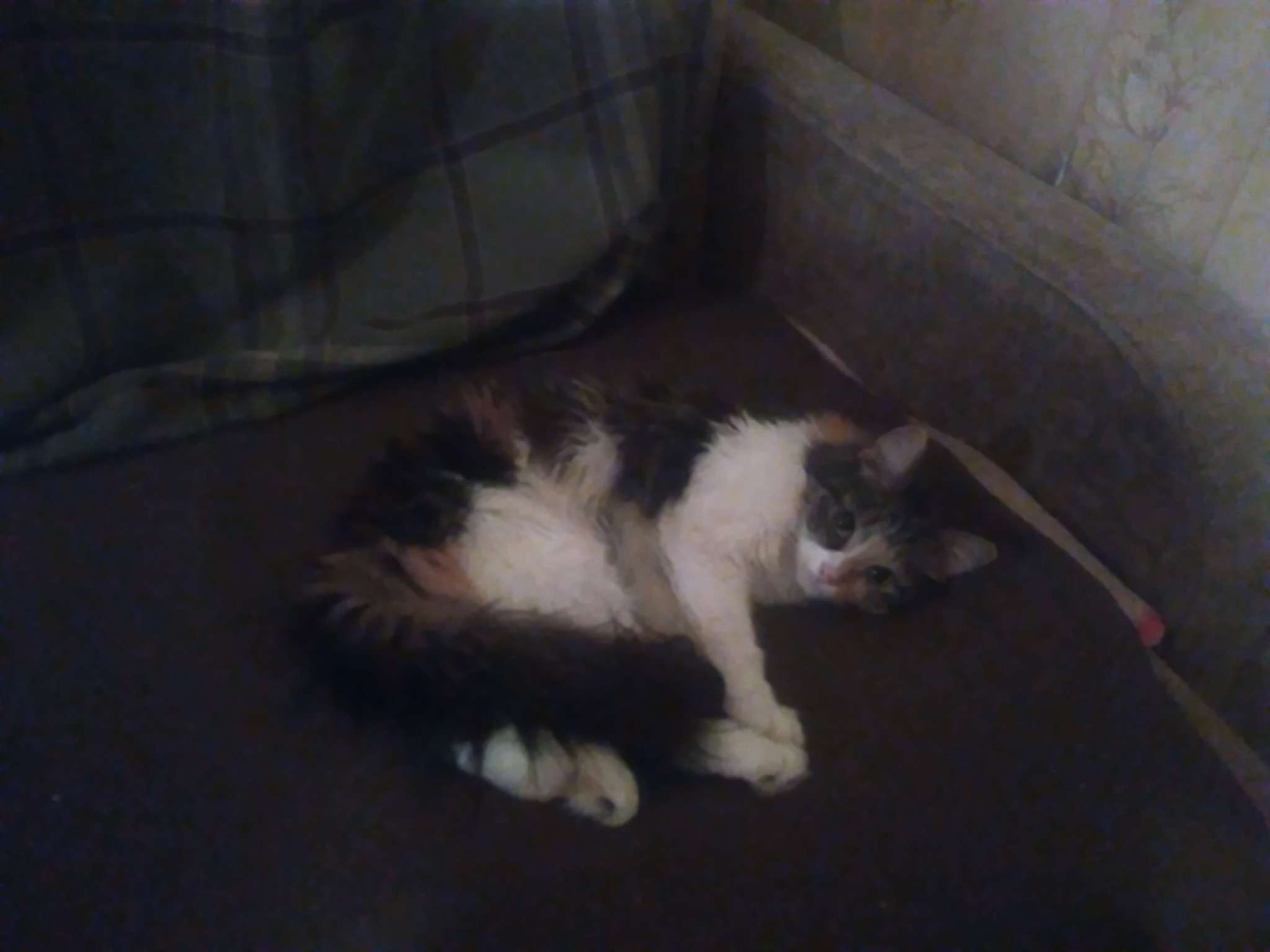 Вчера подобрал возле 5тёрочки, бегала за людьми и кричала, на данный момент нажралась и спит.
