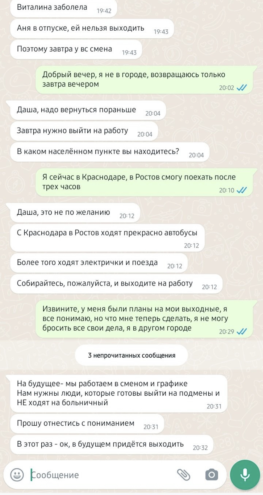Поговорить? Серьёзно? Я пытался говорить около двух месяцев, вежливо, культурно, чуть ли как Лев Николаевич изъяснялся, но все разговоры игнорировались. Ни разу не нахамил, тембра голоса не повысил. Всё это время меня слали к чёрту, но как только я рванул рубаху....захотели поболтать по душам) За что и были вежливо посланы в направлении пяти букв. Ей Богу, у этих людей хватает совести затирать мне про то что я не пытался договориться. Они не принимали всерьёз мои причины сильно не задерживаться, иногда до поздна. Проще говоря: чхать они хотели на то что у меня есть жизнь, и сторонняя учёба впридачу. Полагаю, теперь я имею полное право начхать на их трудное положение и хлопнуть дверью. Мне столько не платят, чтобы терпеть это хамство.