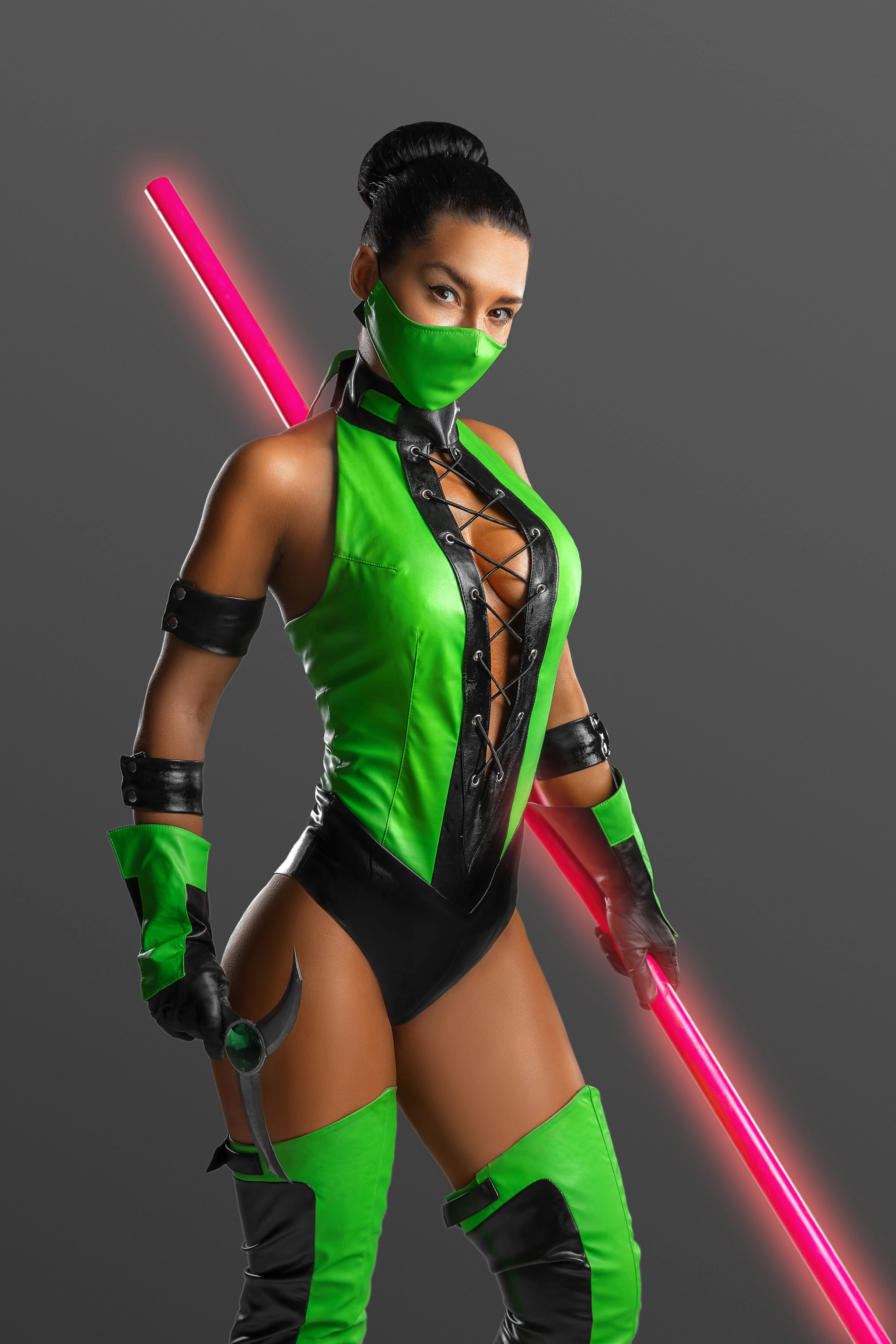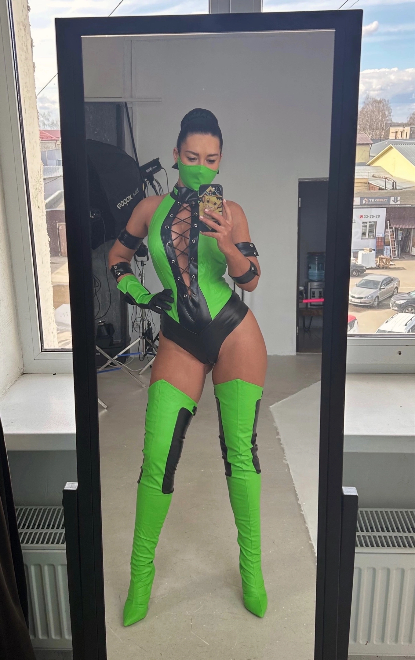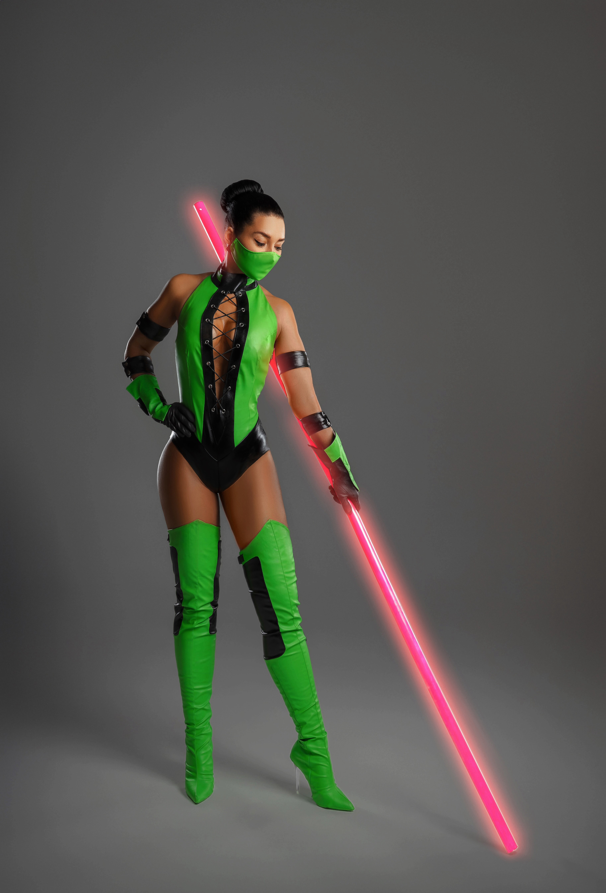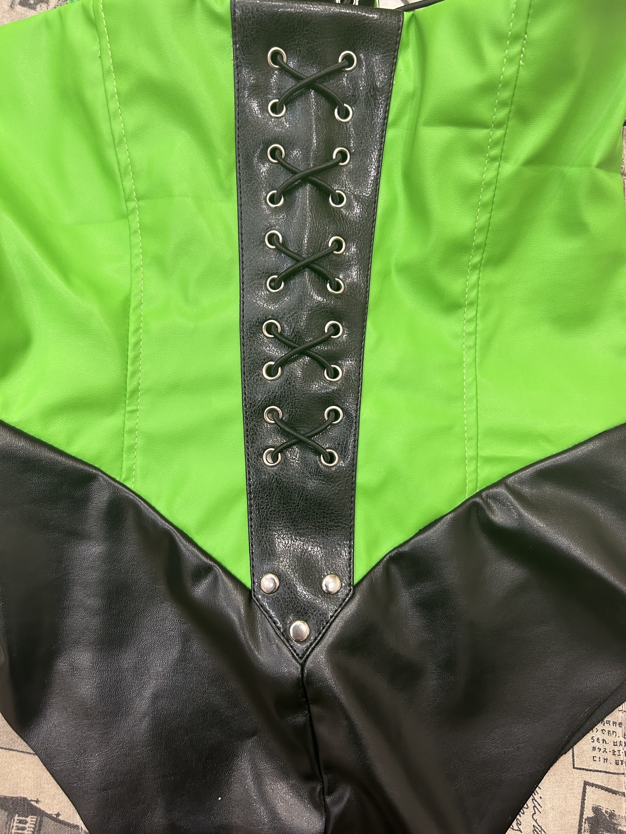 Что касается костюма, то он сделан из кожзама ярко-зеленого и черного цветов, с люверсами, шнуровкой и прочим. Я искала искусственную кожу этого ярко зеленого оттенка очень упорно. Использовать бифлекс не хотелось (сильно удешевляет образ). На выручку пришли, как водится, наши китайские братья, на алиэкспресс нашелся нужный материал.