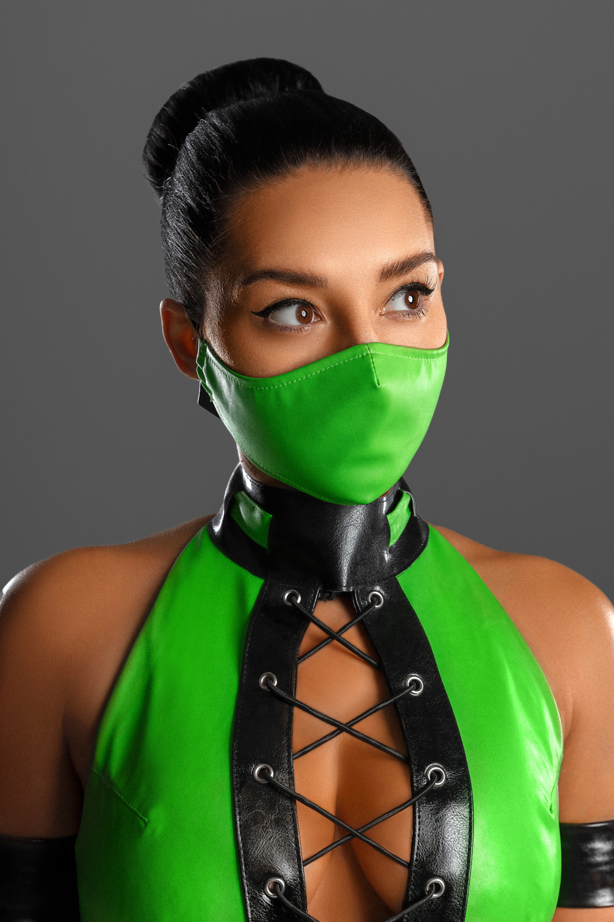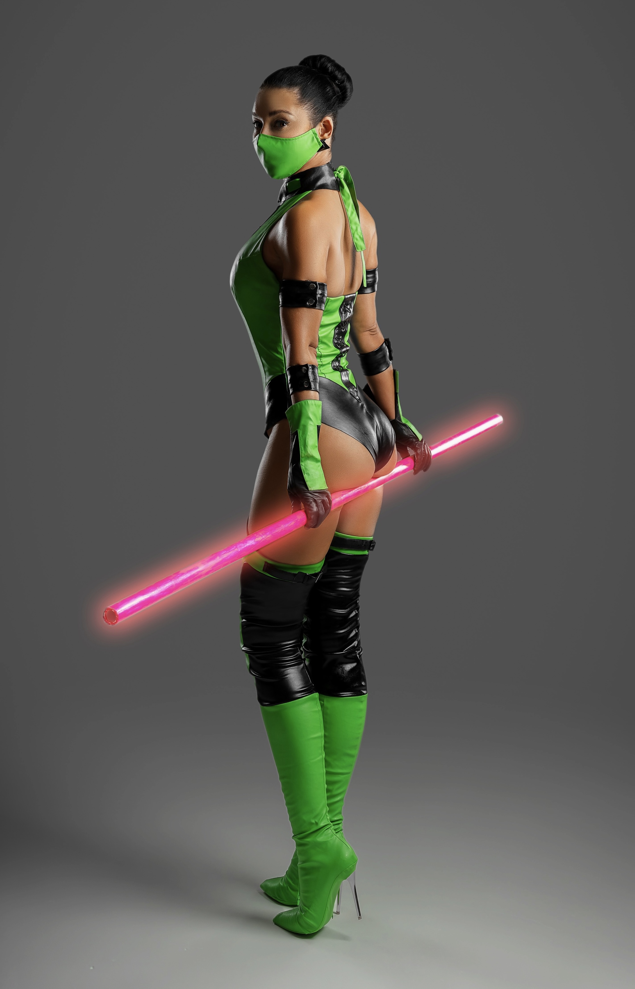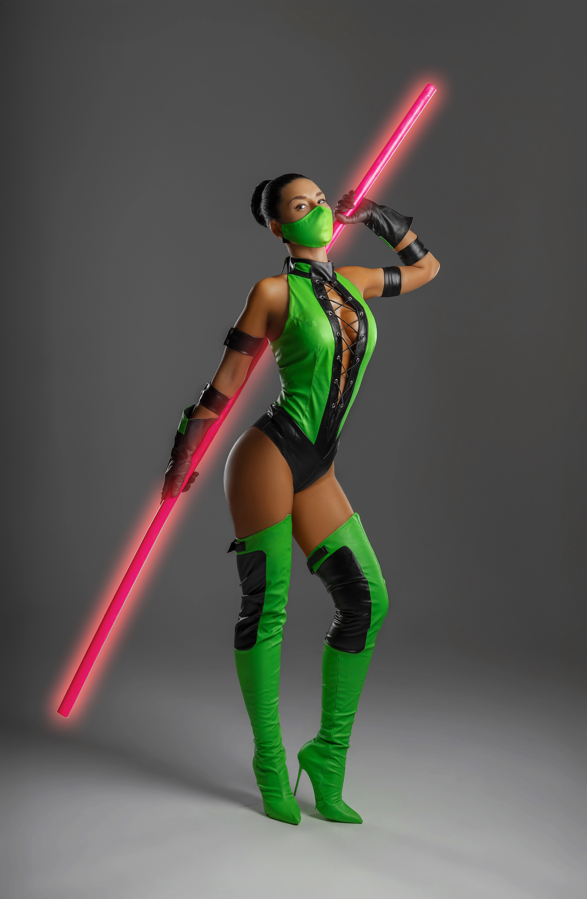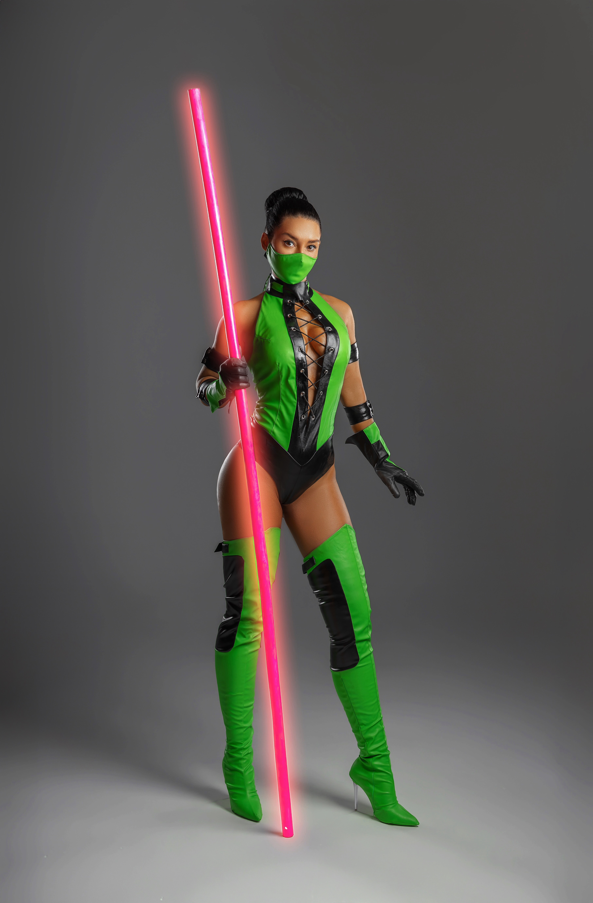 Что касается костюма, то он сделан из кожзама ярко-зеленого и черного цветов, с люверсами, шнуровкой и прочим. Я искала искусственную кожу этого ярко зеленого оттенка очень упорно. Использовать бифлекс не хотелось (сильно удешевляет образ). На выручку пришли, как водится, наши китайские братья, на алиэкспресс нашелся нужный материал.