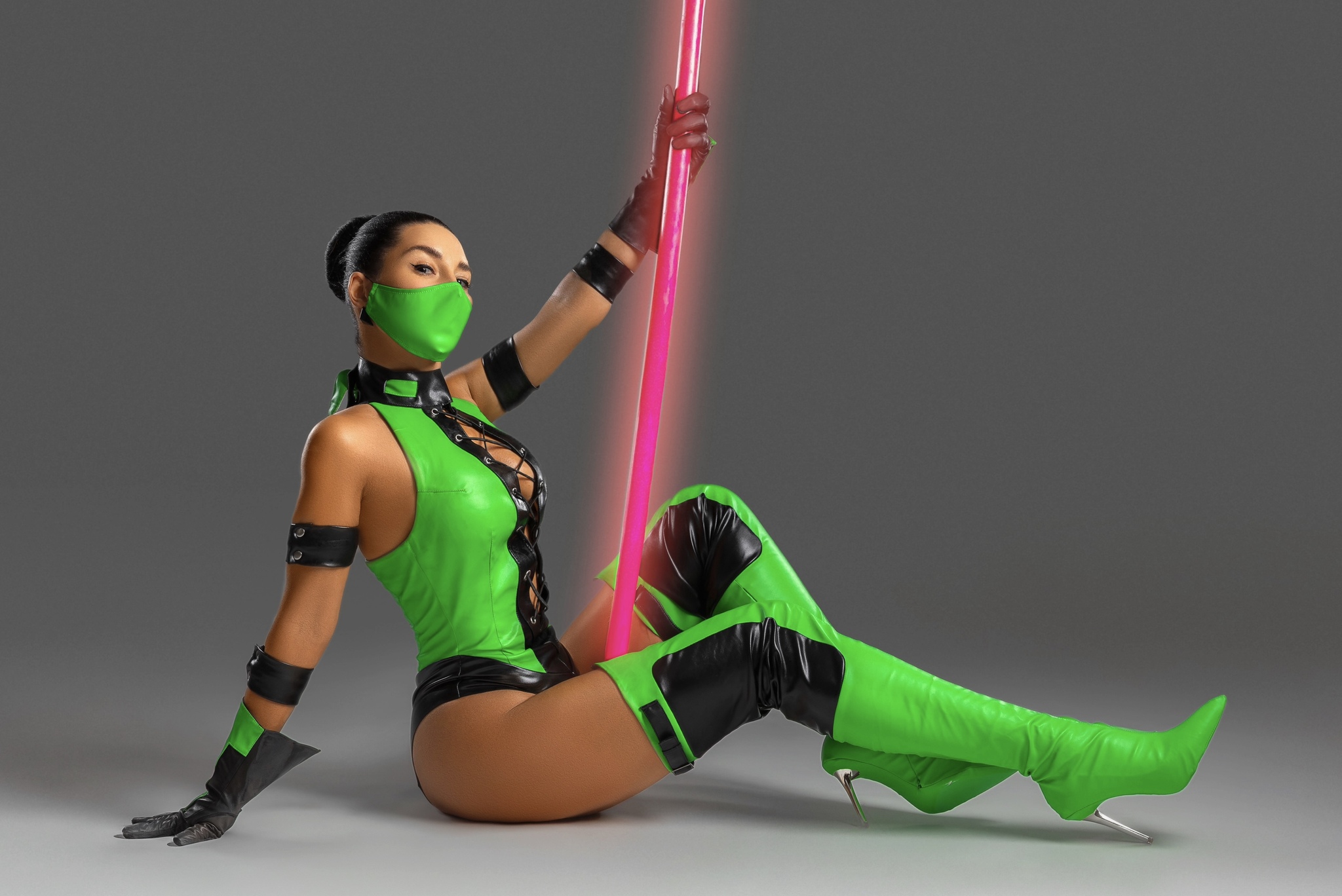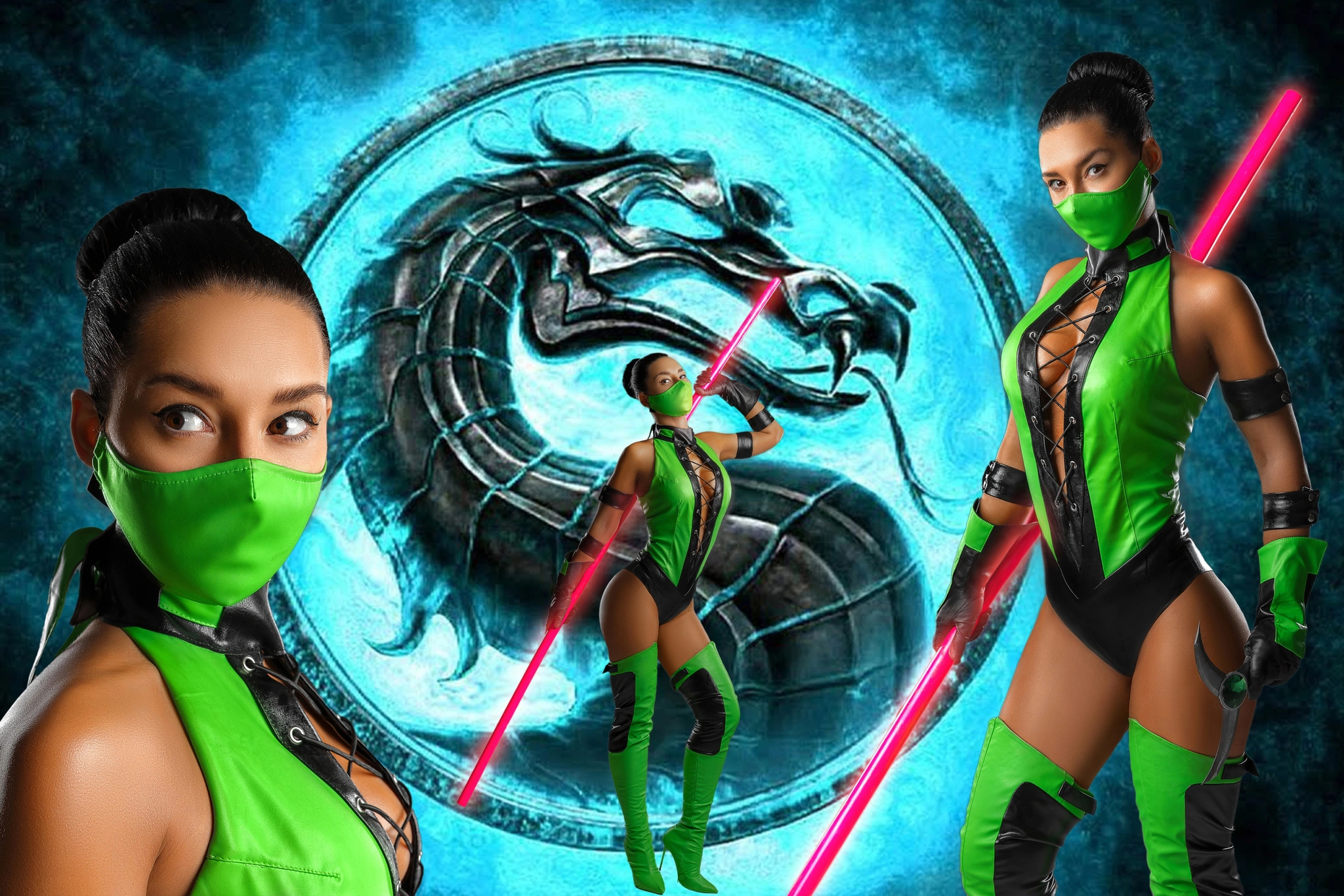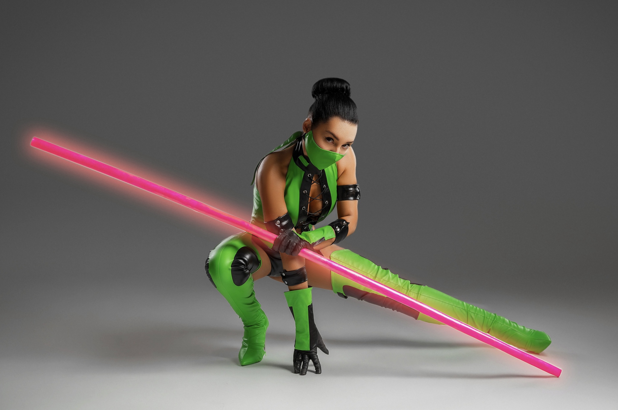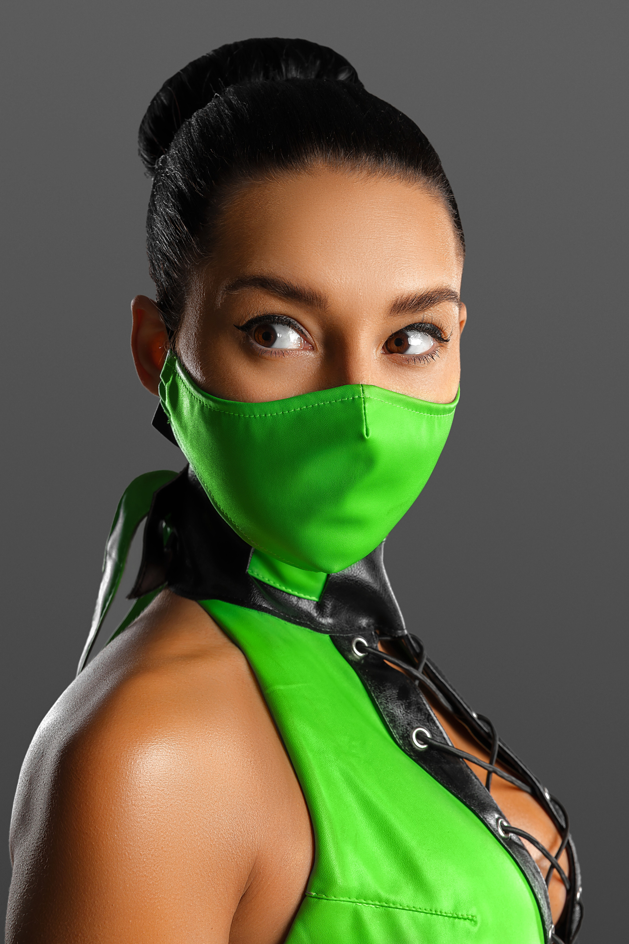 Что касается костюма, то он сделан из кожзама ярко-зеленого и черного цветов, с люверсами, шнуровкой и прочим. Я искала искусственную кожу этого ярко зеленого оттенка очень упорно. Использовать бифлекс не хотелось (сильно удешевляет образ). На выручку пришли, как водится, наши китайские братья, на алиэкспресс нашелся нужный материал.