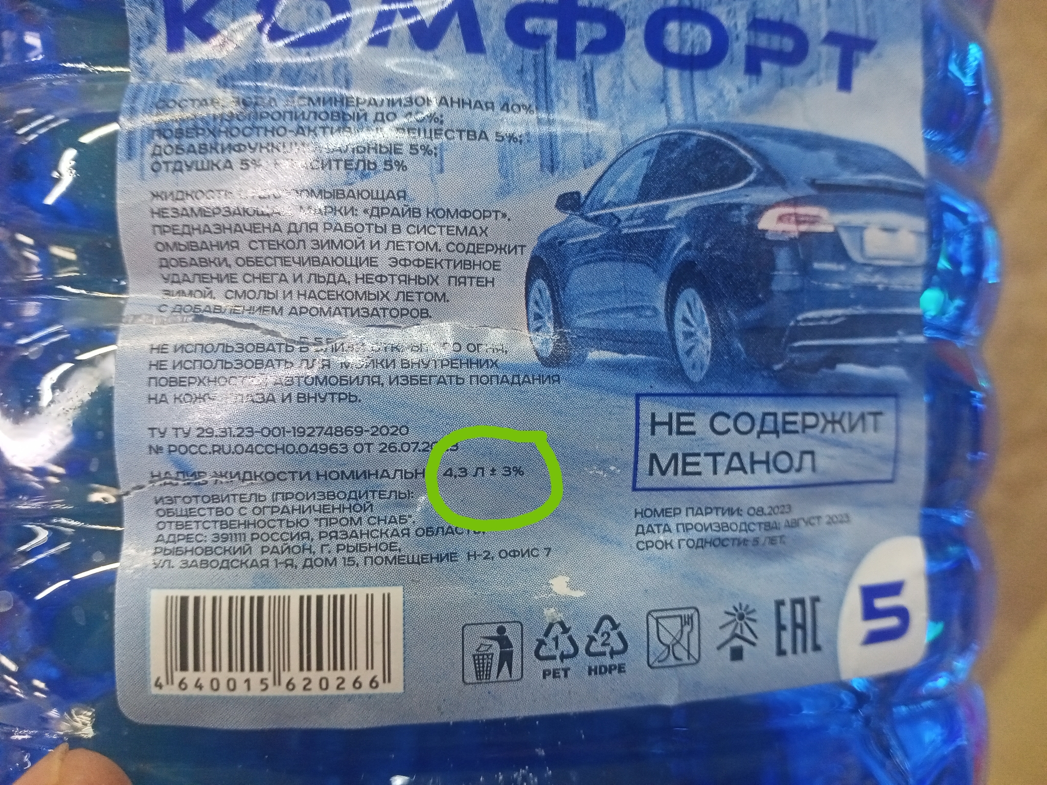 Вон, внизу справа цифра 5, в глаза бросается. Но это ложь. Мелкий текст гласит: "Налив жидкости номинально 4,3 л". Это на шкринфляцию не списать, это прямой обман покупателей. Линия, вы лживые суки!
