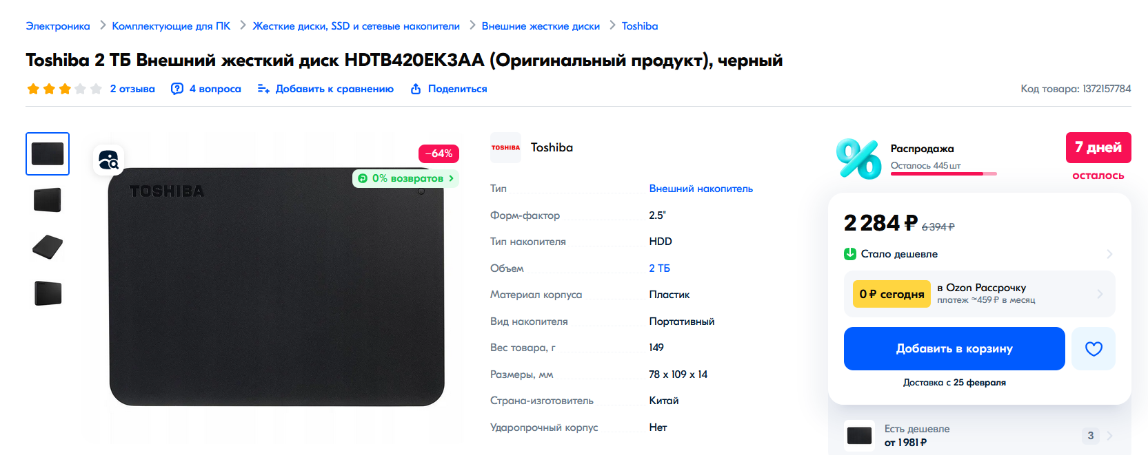 Цитата: "Toshiba 2 ТБ Внешний жесткий диск HDTB420EK3AA (Оригинальный продукт), черный".