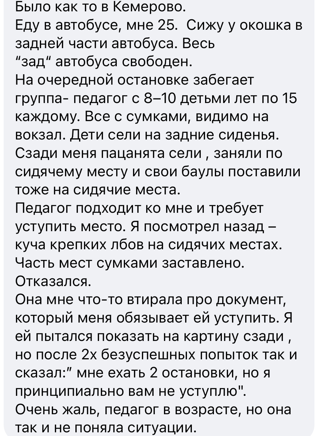 Едем с супругой (7й месяц беременности) в автобусе, зашли, думали что места есть, оказалось нет, классика жанра. Какой то молодой парень уступает место моей супруге, только поднимается, говорит ей "садитесь", как внезапно женщина (не сказать что пожилая, но лет 45-50 на вид), резко кладёт сумку на сиденье, и бухается своей тушей в кресло.
