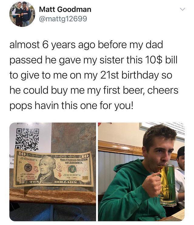 Почти 6 лет назад, перед своей смертью, отец оставил моей сестре 10 баксов, чтобы она передала их мне на мой 21 день рождения и я мог купить на них свое первое пиво. Этот бокал я поднимаю за тебя, отец!