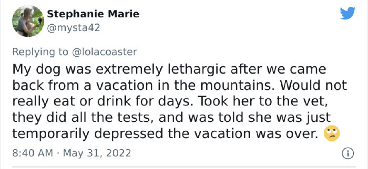 После того, как мы вернулись из отпуска в горах, моя собака была очень вялой. Она почти не ела и не пила в течение нескольких дней. Отвезла ее к ветеринару, после обследования мне сказали, что у неё просто временная депрессия, так как отпуск закончился.