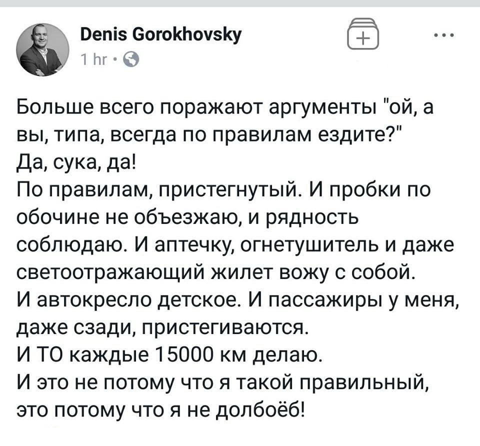 Почему у меня горит? Потому что я езжу по городу, в машине со мной жена и дочка 5 лет и я нихера не хочу рисковать ИХ жизнями ради долбоебизма и подписок очередного блохера, который решит погонять по встречке ради лайков и подписок