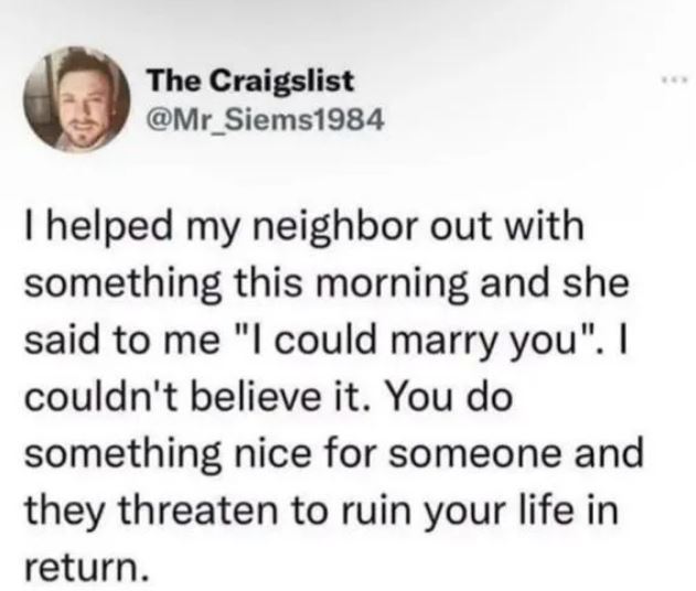 Этим утром я помог своей соседке кое с чем, и она сказала мне: "Я бы вышла за тебя замуж". Я не мог в это поверить. Ты делаешь что-то хорошее для кого-то, а этот человек в ответ угрожает разрушить твою жизнь.