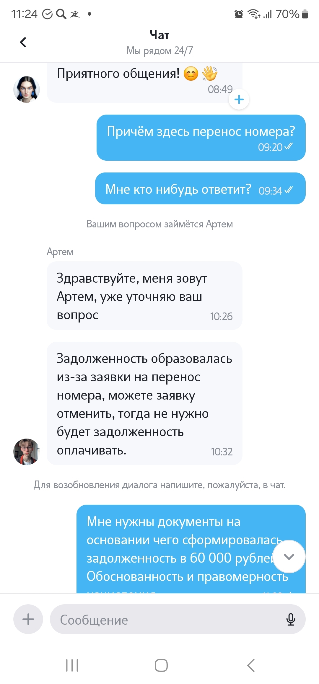 Со слов поддержки-за "Красивый номер". Мой номер изначально открыт в МТС. В личном кабинете никакой информации нет о красивом номере и стоимости. Предоставить ничего не могут из чего складывается сумму 60000 руб. При переходе я не подписывала никакие заявки и доп соглашения о "Красивом номере", так же в тарифном плане не было никаких пунктов об этом. Я не покупала, не арендовала и не использовала никакие услуги и промокоды связанные с услугой "Красивый номер". Поддержка ответила или платите 60000 и можете тогда перейти к другому оператору или оставайтесь у нас и мы аннулируем задолженность.