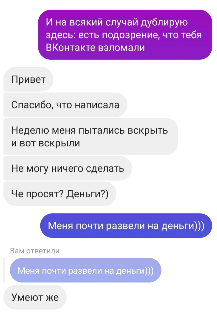 И всё стало ясно. Ника бы назвала фамилию сразу. Так что в этот момент я уже пишу настоящей Нике в телеграм и дублирую в инст, что её взломали.