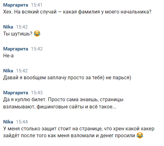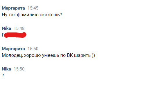 Ребята посмотрели ВК страничку места моей работы, увидели человека, который в группе значится как директор, и написали фамилию. Только вот это девичья фамилия. Да и спрашивала я фамилию начальника, а не начальницы. Ника бы сразу ответила верно.