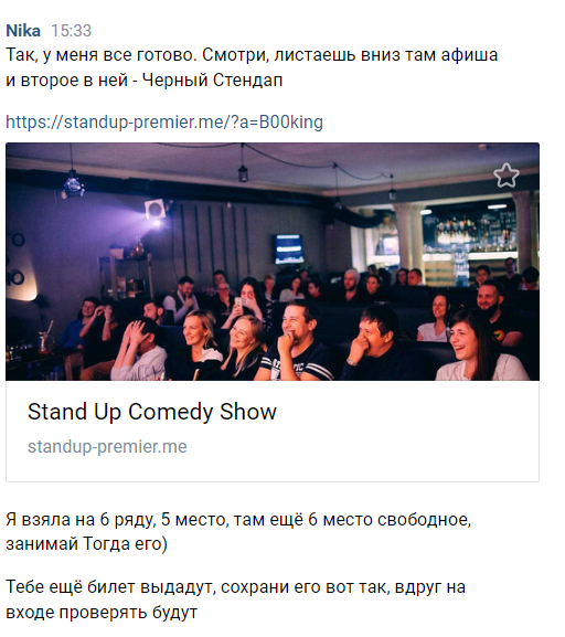 Говорю Нике об этом, получаю в ответ, мол, я докину сколько надо, а в цену билета ещё входит открытый бар, то есть еда и напитки будут бесплатные.
