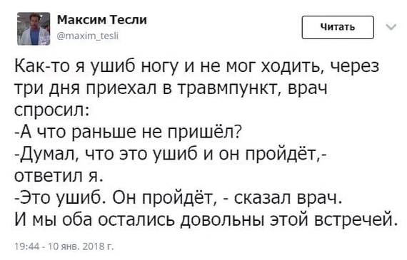 Один скупой чиновник, явившись к Нотнагелю впервые, решил представиться постоянным пациентом и обратился к врачу с улыбкой: "А ведь я снова к Вам, господин доктор!"