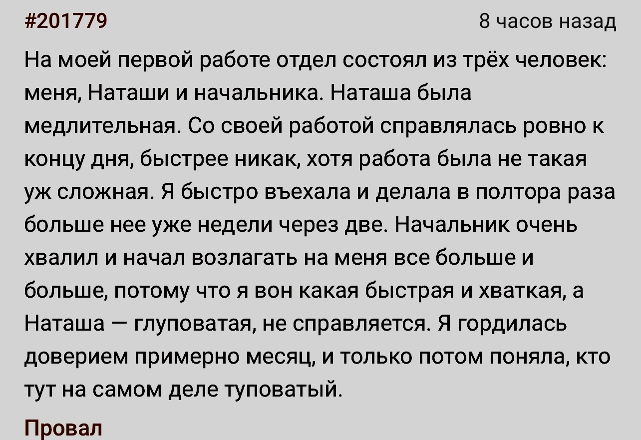 Теперь Наташа — страх номер один. Так мало того, она периодически звонит мне и моей дочери и спрашивает, всё ли нормально, не хочет ли никто отправиться пожить к папе ещё раз. После её звонков дочь ещё более послушная и милая.