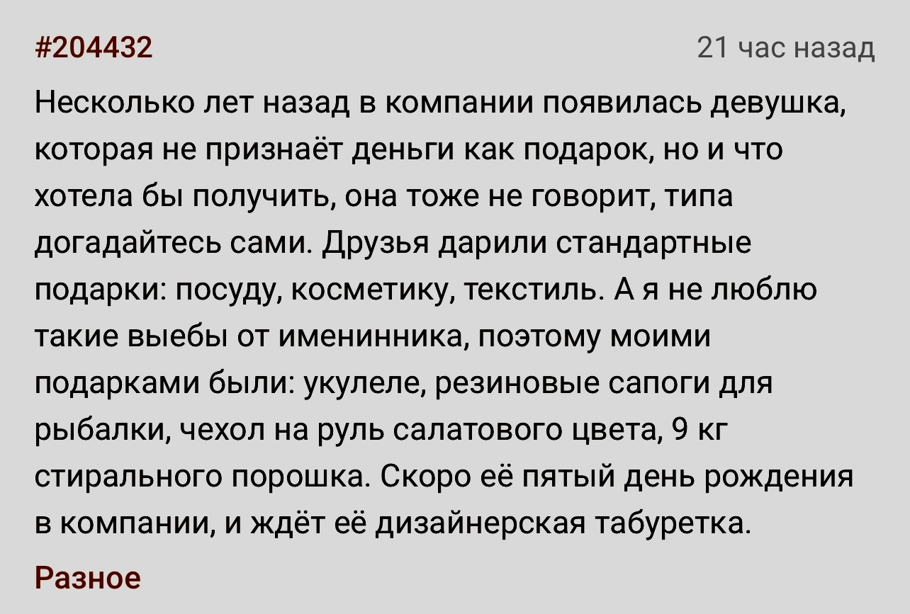 Когда парень (сейчас он муж) знакомил меня со своими родителями, то будущая свекровь уточнила, есть ли у меня пищевые аллергии, есть ли продукты и блюда, которые я не переношу и есть не буду (меня обсыпает от цитрусовых, и я просто ненавижу белую рыбу. Особенно карасей и щуку!). Всё услышанное она записала в пухлый ежедневник. Поймав мой вопросительный взгляд, она пояснила, что у неё муж, 4 сына, 3 невестки, 6 внуков от года до 10 лет, и каждый либо что-то не ест, либо аллергия. И у всех разное! Чтобы не забыть, она записывает и сверяется во время подготовки меню для семейных пиршеств. Чтобы каждый мог отведать минимум 2 блюда без своих неприятных продуктов. Через несколько месяцев, когда мы уже подали заявление в ЗАГС, я попала на празднование годовщины их со свёкром свадьбы. Стол ломился: несколько видов горячего, салаты, нарезки, закуски. Но больше всего меня поразили маленькие подставки рядом с каждым блюдом, на которые были наклеены этикетки с составом. Даже если этот состав состоял из двух ингредиентов! Оказывается, у свекрови даже специальный принтер есть, который эти этикетки печатает. Мне сразу вспомнилось, как мои мама и бабушка пытались впихнуть в меня ненавистную белую рыбу — крошили в салаты, рулеты и бутерброды. Мама однажды на Новый год приготовила полностью рыбный стол, и 2015 год я встречала нарезкой из яблок. Никто из них не верил (и до сих пор не верит), что меня подташнивает от неё. И вдруг я встречаю совершенно другое отношение к чужим пищевым пристрастиям — деликатное и уважительное. Чуть не расплакалась прямо при всех. Свекровь не перестаёт повторять, что нужно уважать чужие предпочтения и привычки. Все люди разные.
