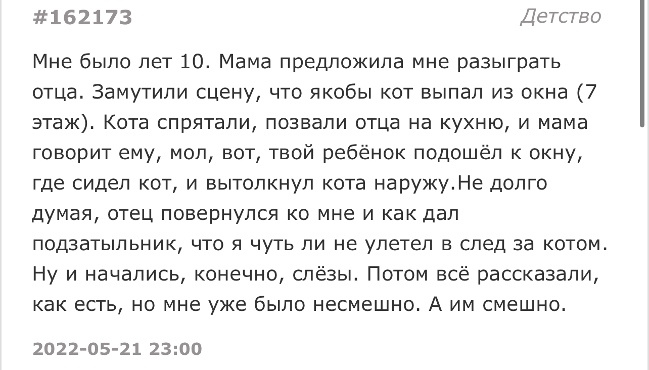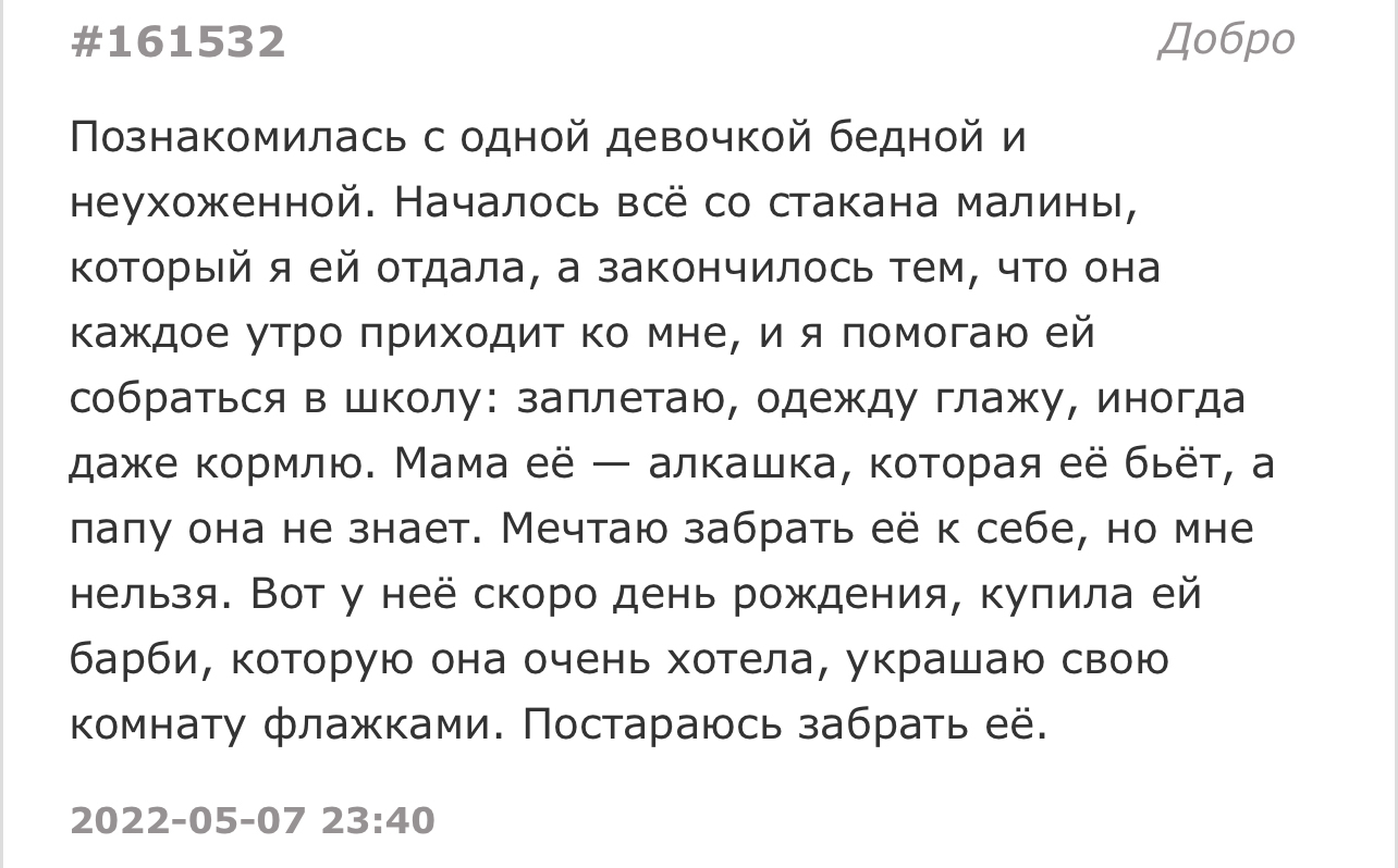 Жил до 17 лет в деревне. Много разной живности держали: козы, коровы, куры, фазаны. Как-то раз на озере ещё и диких утят поймал. Загнал их в клетку и спать пошёл. Среди ночи вышел на улицу в туалет, а рядом с клеткой с утятами мама-утка стоит. Детки по клетке запрыгали, загулили, мама так и стоит, не уходит. Открыл клетку и отпустил всех.