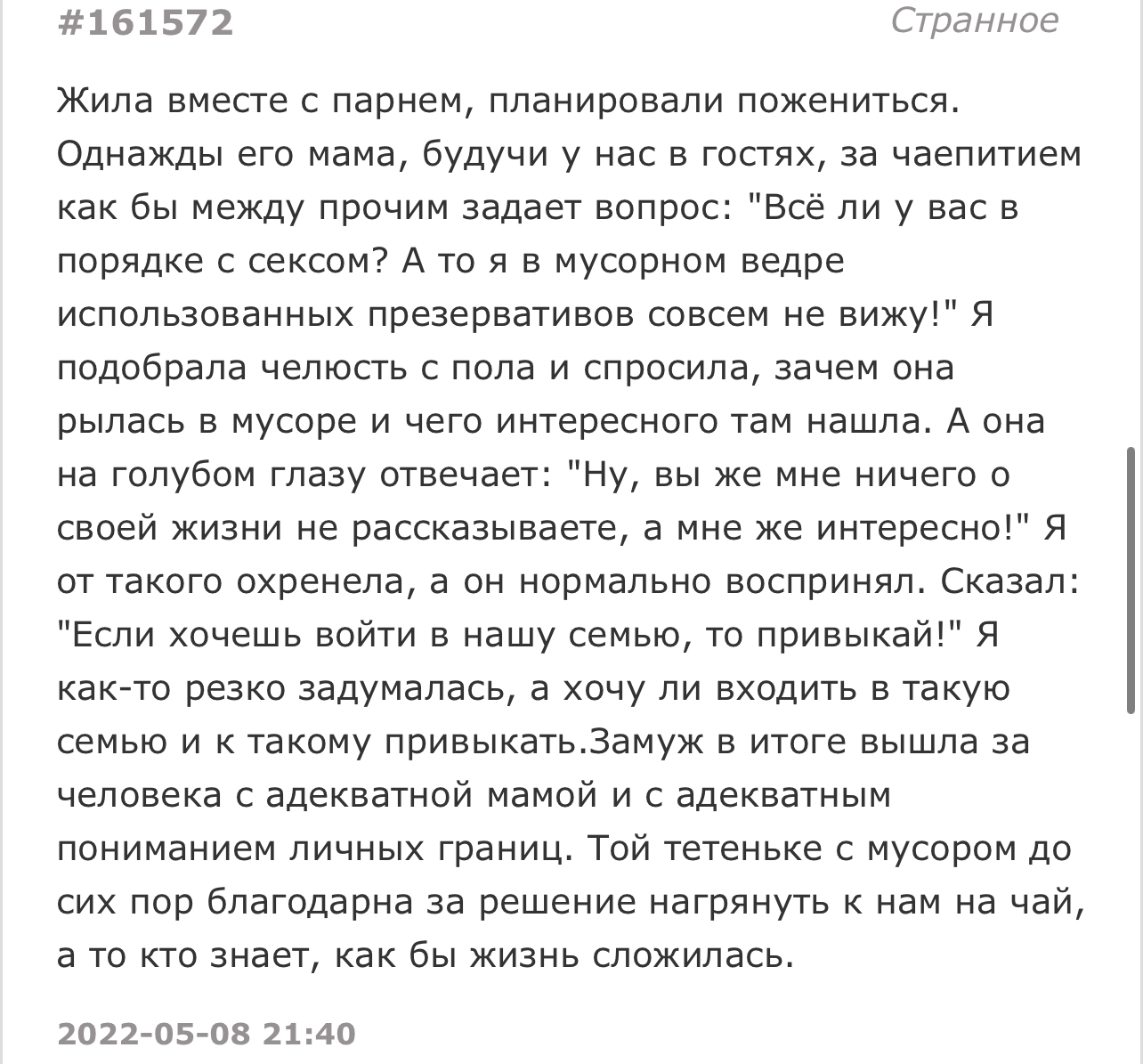 Хожу в резиновых сапогах. Люди косятся, свекровь говорит, что я, как бабка, муж спрашивает: "Неужели нельзя надеть что-то другое, ведь никто сейчас сапоги резиновые не носит". А мне непонятно, почему никто не носит, ведь у нас грязь жидкая, ходят в забрызганной замшевой обуви, в заляпанных туфлях, шлёпают по лужам в кроссовках, тонут в грязи в красивых ботах. А дура почему-то я.