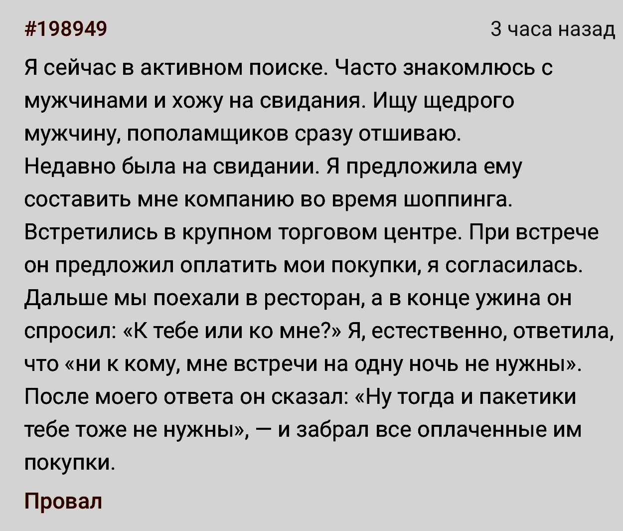Встречался с девушкой. Попросила в долг крупную сумму денег. Очень крупную. Откладывал на машину, поэтому имел при себе такие деньги. Причём запрашиваемая сумма чётко совпадала с той, что была у меня в сбережениях. Тогда не обратил внимания. Просила матери на лечение. Подумал, что не по-людски будет отказывать в помощи лечения возможной тёщи. Согласился, но при условии, что она даст мне расписку. Неохотно, но дала. Так же заскринил весь диалог, где обсуждалось это. Не прошло и трёх месяцев, как мы сразу начали не сходиться характерами и нам нужно расстаться. Возникать не стал, попросил вернуть деньги, так как и срок уже подходил, и вылавливать её я не собирался. Устроила цирк. Теперь я меркантильный урод, жлоб и тварь, который "сам дал и теперь требует вернуть", после чего сразу полетел в чс. Как же она начала мне написывать, когда ей вручили повестку в суд. И сразу хороший и добрый, была не в своём уме, и отношения хочет возобновить. Игнорировал, мне плевать. Просила 2 года, чтобы могла по частям отдавать, послал лесом. Так же связался с её мамой. Она была в огромном шоке, когда узнала, что, оказывается, была больна и нуждалась в дорогостоящем лечении, а когда узнала про суд, потеряла дар речи. Вся её семья мне написывала и просила всё остановить, готовы были отдавать с процентами, но так же ставили огромные временные рамки. Мне чужого не нужно. Нужны мои деньги, и не через год-два, а сейчас. По итогу суда она обязана возместить мне ранее взятую сумму, а так же моральный ущерб за 4 месяца. И весь этот цирк ради чего? Новый айфон, ювелирка и шмотки дорогих брендов. Как же хорошо, что я тогда взял расписку и всё заскринил, ибо осознать, что какая-то дрянь спустила сотни тысяч твоих кровных на шмотьё, очень стрёмно.