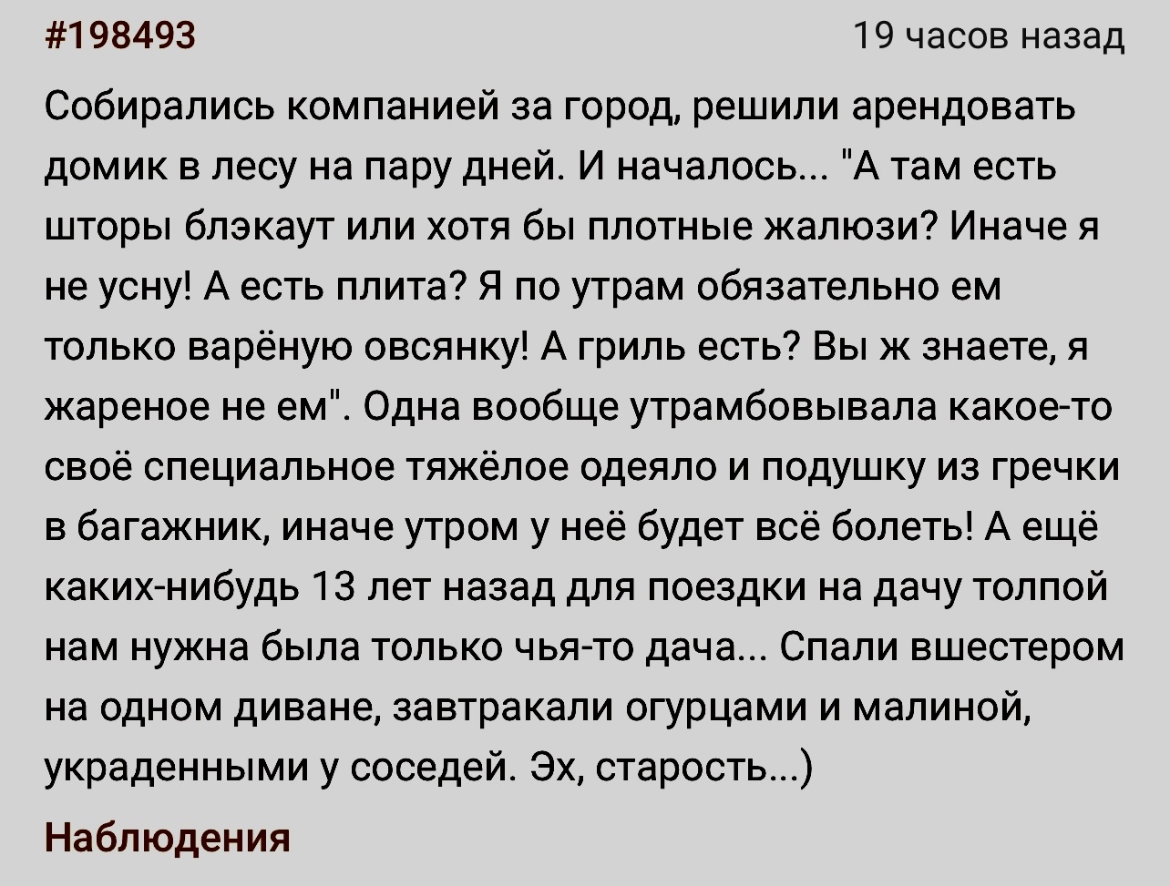 В шоке от наглости человеческой. У сестры мужа, торбы неповоротливой, были ключи от нашего гаража с подвалом, они там хранят свои несезонные вещи. Два раза подряд я ездила за картошкой и заметила, что она как-то уж быстро убывает. Сестра в посадке, прополке и сборе урожая не участвовала. Дважды угощали её картошкой по ведру, но кормить её семью на постоянной основе мы не собирались. Сказала мужу, что нашей картошки на две семьи до конца зимы не хватит, сменил замок. Сегодня сестрица его звонит с истерикой, почему это мы ей не дали комплект новых ключей. На вопрос, что ей там зимой понадобилось, велосипед или самокат, распсиховалась и отключилась. Сажай-ка ты, Настенька, свою картошку и нам пару мешков отсыпать не забудь.