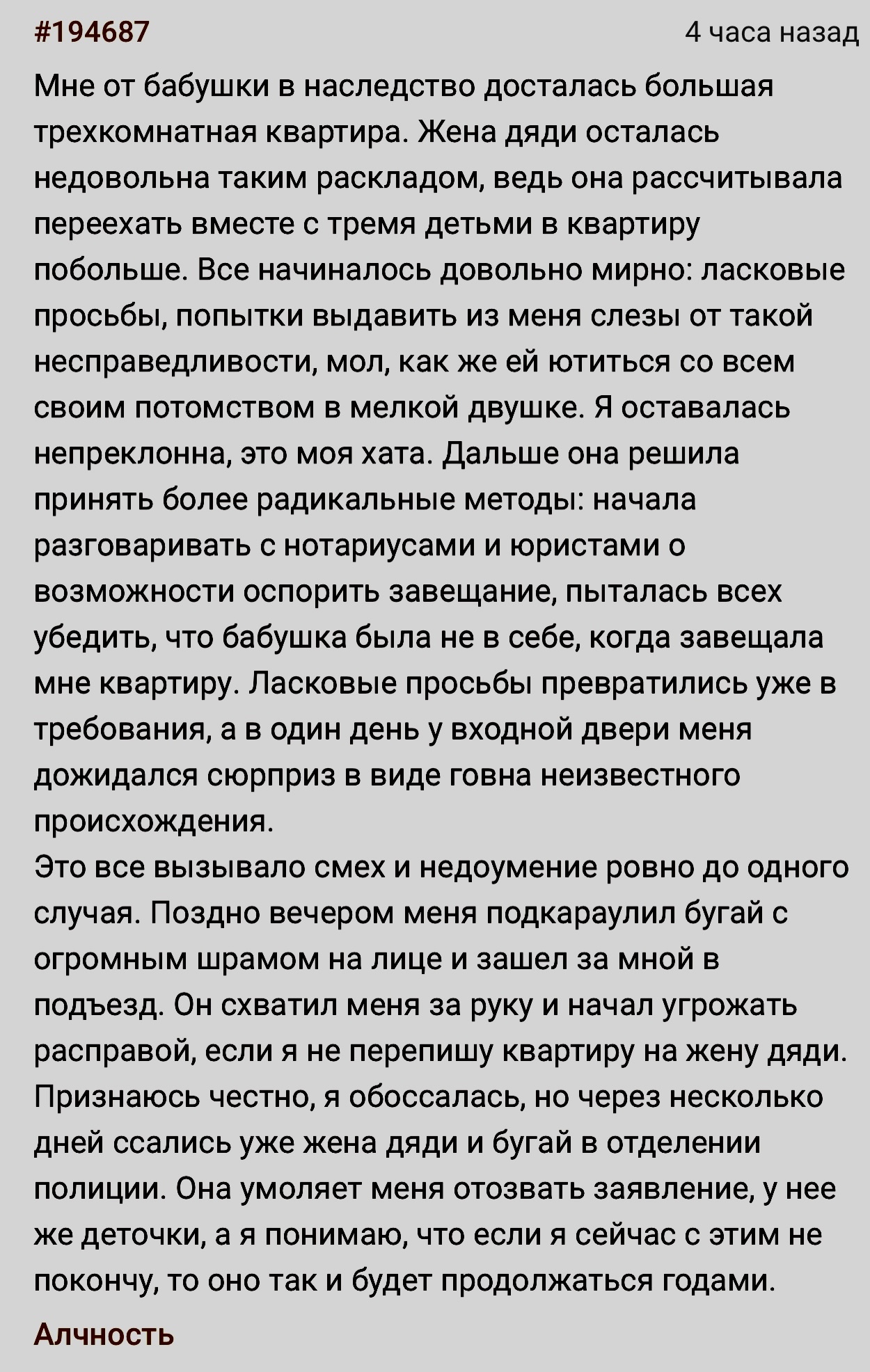 Как у многих, наверное, у меня есть бесцеремонные родственники, которые могут все: за праздничным столом вспомнить, как я обосрался в детстве; "занять" денег и не вернуть; выклянчить какую-то вещь и подобное. А жена у меня не то чтобы аристократка, но довольно замкнутая, малознакомым кажется высокомерной, не любит лишнего шума и скандалов, хотя иногда откалывает такие номера, что я только диву даюсь. После свадьбы мы жили отдельно, в городе, платили ипотеку, ничего, как говорится, не предвещало. И вдруг в субботу с утра без предупреждения к нам заваливает моя тетка с мужем и двумя детьми-подростками, радостно вопя, что они к нам на две недели. Мол, погулять решили, детей к школе приодеть. У меня от ужаса в зобу дыханье сперло. Просто я-то точно знал, что будет дальше: кормить эту ораву за свой счет, попойки каждый вечер ("Ты меня уважаешь?"), тупые сериалы на полную громкость и прочее. Стою столбом, лихорадочно соображаю, что делать. Скандал устраивать? Матери звонить и ей скандал устраивать? Из дому сбежать? И тут моя дорогая супруга прямо расцветает и радостно орет: "ОТЛИЧНО! СУПЕР! Ремонт надо делать, а тут вон сколько помощников сразу! А я-то думала, как мы вдвоем мебель таскать будем! Щас быстренько перекусить сварганю, и мы срочно поедем за обоями и краской, а вы отдыхайте пока! Отлично устроимся: в воскресенье ударно бахнем, потом вы с утра гулять, мы на работу, ну а все вечера наши!" — и начинает носиться по квартире, шторы сдергивать, стены промерять, на ходу объясняет, какие она обои хочет, какие плинтуса, интересуется, как у дорогого дяди дела с шуруповертом. А штукатурить? Нет? А плитку класть? Я таких ошалевших рож ни разу в жизни не видел. Тетка нашлась первая, заблеяла, мол, Олечка, да мы же мешать вам будем и детям вредно краской дышать ("Да какие ж это дети? Орлы! Без стремянки потолок достают!"), нет-нет, Олечка, если б мы знали, мы лучше к кому-нибудь другому или хоть в гостиницу... Проводили, короче, гостей. Ремонт решили не делать. Шторы постирали и все.