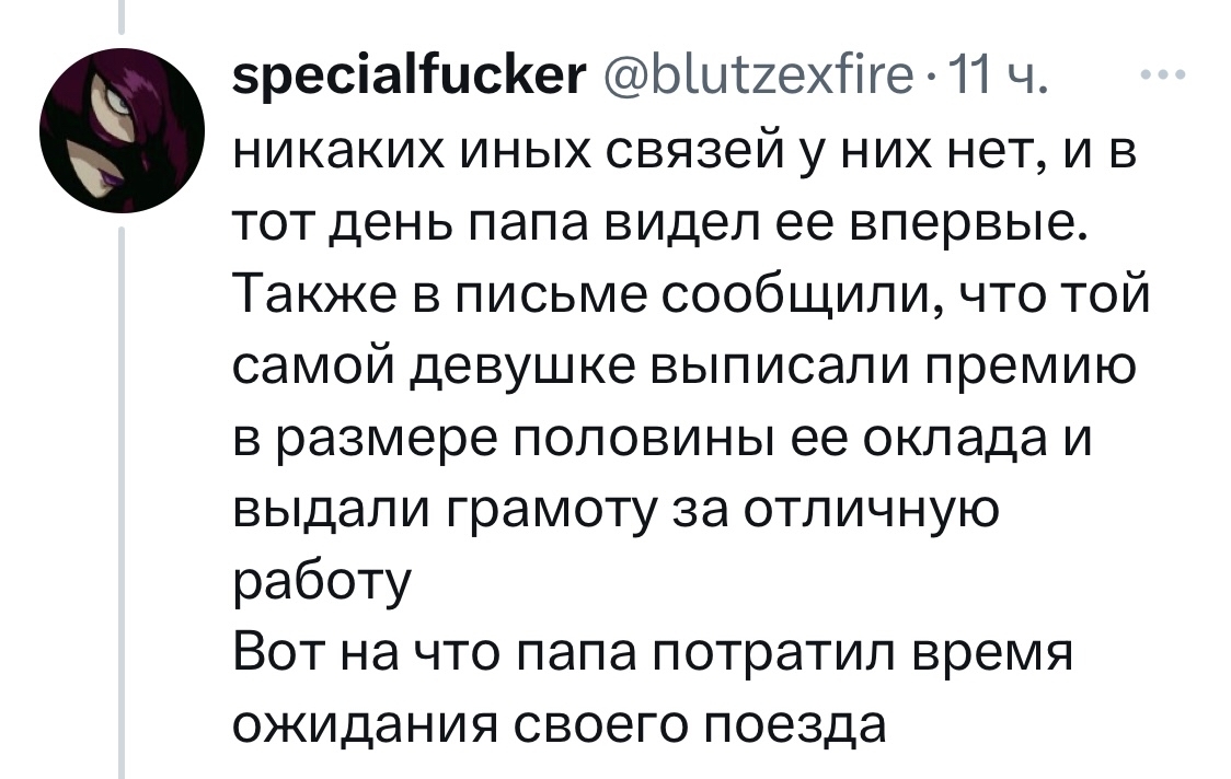 "Дембеля", которые ехали на поезде 091а Мурманск - Москва в 11-м вагоне, прибывшем 17.06, я не обеднею из-за потери 1000₽, которую вы заняли, обещая вернуть в Москве. Но мне было смешно наблюдать, как вы первыми бежите по перрону в здание вокзала после выхода из поезда…