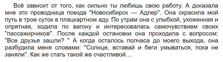 На подъезде к Питеру, когда все начали собираться, вспомнил про эту милую женщину. Решил сходить до неё, чтобы поинтересоваться, не помочь ли спустить ту самую сумку. В ответ она, поблагодарив меня, сказала что не надо, что она всё уже съела.