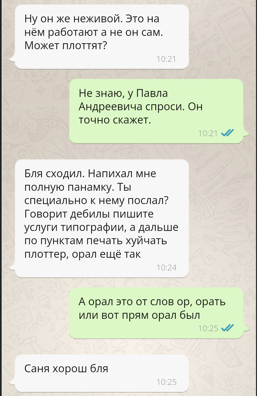 Поговорить? Серьёзно? Я пытался говорить около двух месяцев, вежливо, культурно, чуть ли как Лев Николаевич изъяснялся, но все разговоры игнорировались. Ни разу не нахамил, тембра голоса не повысил. Всё это время меня слали к чёрту, но как только я рванул рубаху....захотели поболтать по душам) За что и были вежливо посланы в направлении пяти букв. Ей Богу, у этих людей хватает совести затирать мне про то что я не пытался договориться. Они не принимали всерьёз мои причины сильно не задерживаться, иногда до поздна. Проще говоря: чхать они хотели на то что у меня есть жизнь, и сторонняя учёба впридачу. Полагаю, теперь я имею полное право начхать на их трудное положение и хлопнуть дверью. Мне столько не платят, чтобы терпеть это хамство.